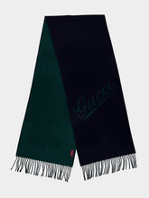 This elegant Gucci scarf combines luxury with timeless design. Crafted from a blend of 90% wool and 10% cashmere, it features a striking navy and dark green palette with the iconic Gucci script jacquard. With a subtle fringe trim, this scarf is both functional and stylish, ideal for layering during colder seasons. A versatile accessory that reflects Gucci's heritage, it adds a sophisticated touch to any look.