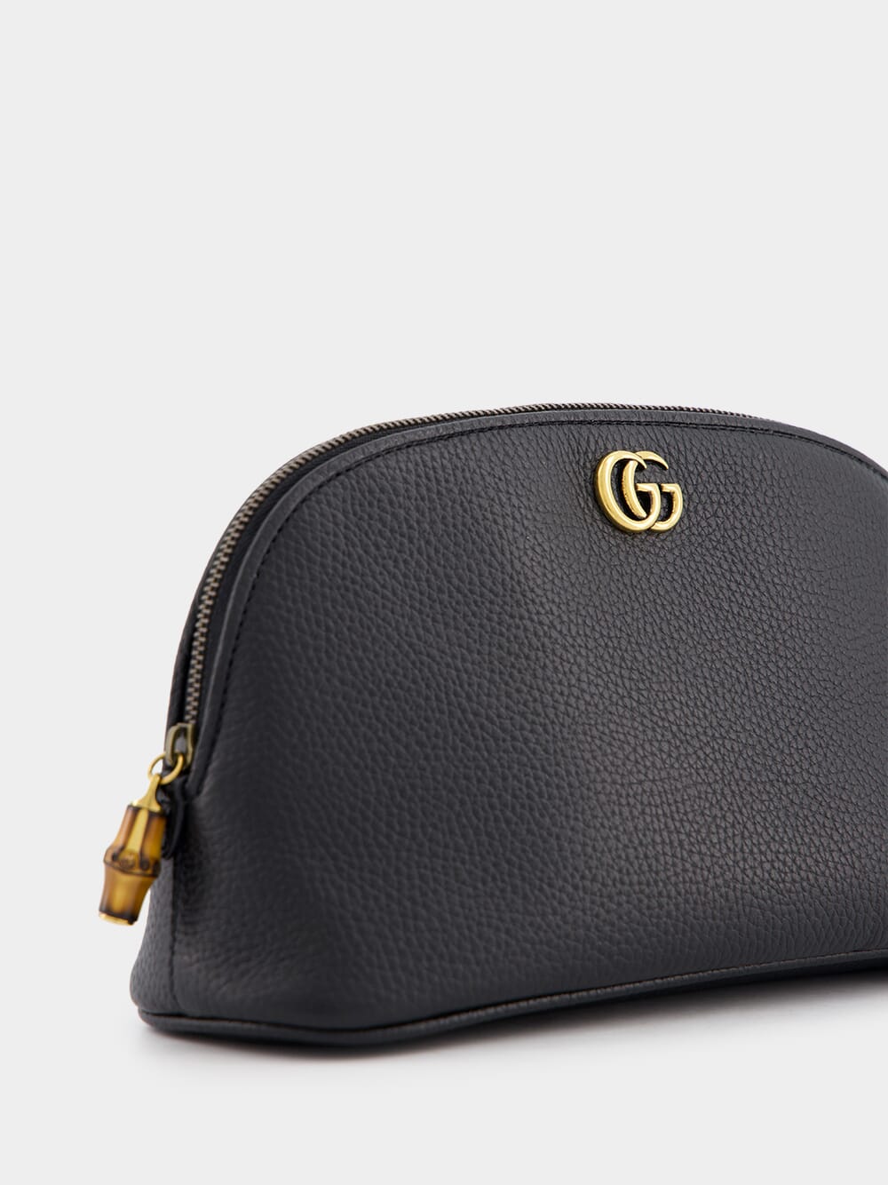 This sleek wash bag is crafted from premium black leather, featuring the iconic GG emblem in gold. Its compact design is perfect for organizing essentials while exuding a sense of luxury and order, ideal for the traveler who appreciates both function and style.