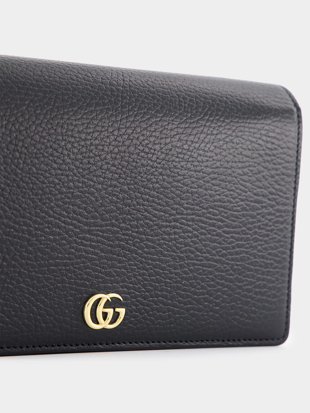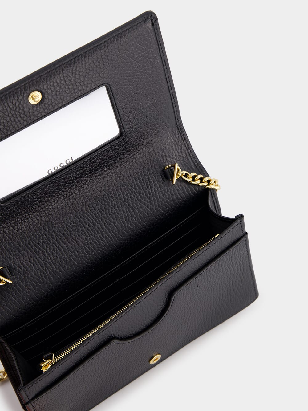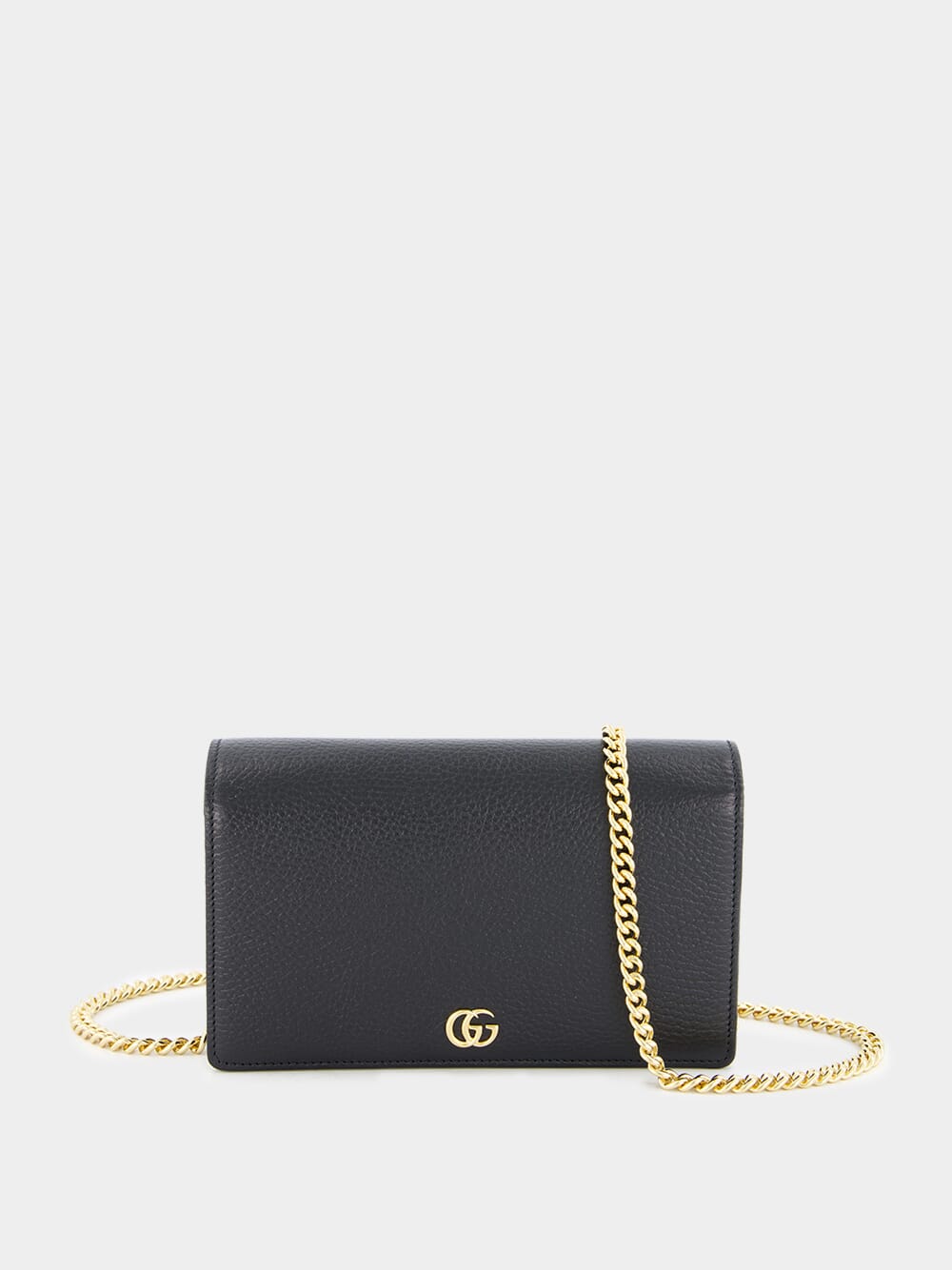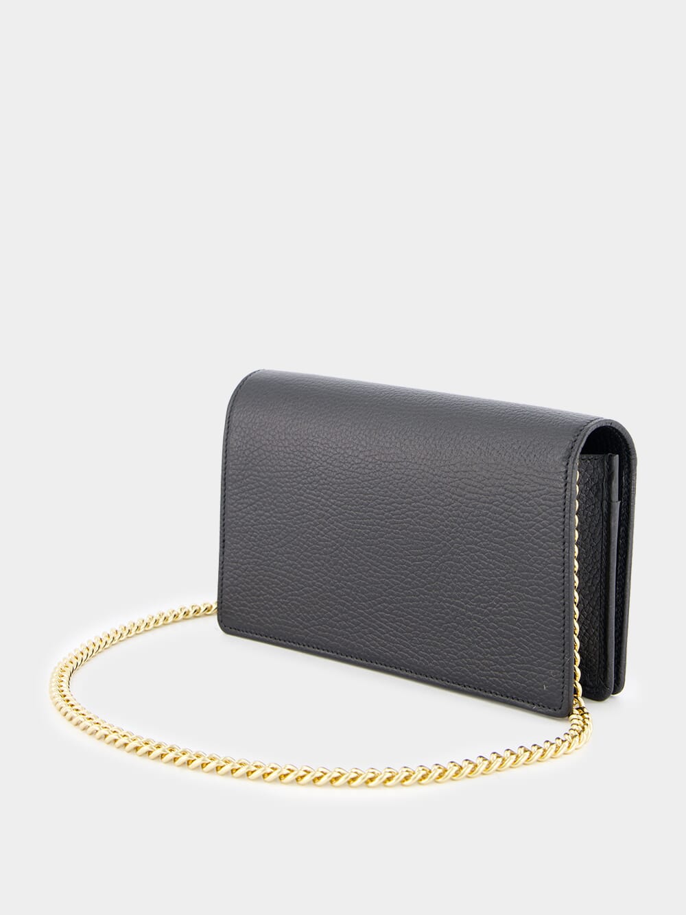 Exuding classic elegance, this black chain bag is a must-have accessory for the luxury aficionado. The rich pebbled leather texture paired with a gleaming gold chain strap offers a sophisticated contrast. Its compact yet organized interior is ideal for evening essentials, featuring card slots and a secure compartment. The iconic logo embellishment solidifies this piece as a timeless investment for any high-fashion wardrobe.
