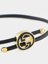 This elegant black leather bracelet from the Pre-Fall 2025 fashion jewelry line showcases a tubular silhouette adorned with a tonal enamel Round Interlocking G. Gold-toned brass details enhance the design’s refined appeal, while the adjustable sliding closure ensures a comfortable, tailored fit. A sophisticated statement piece that adds subtle luxury to any ensemble.