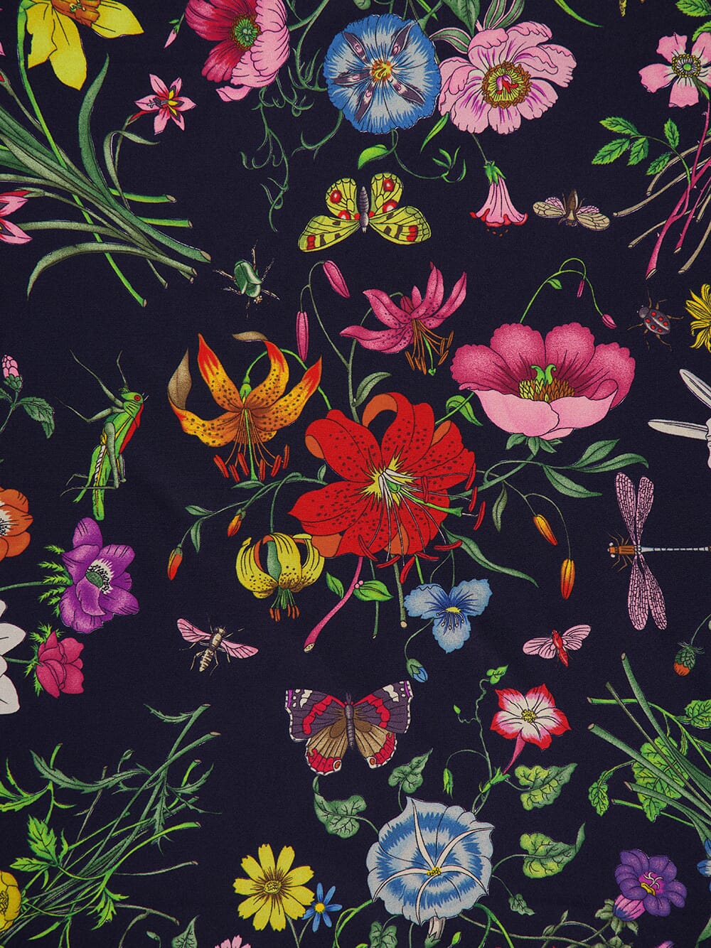 Flora Print Silk Carré, a canvas of romantic narratives from Gucci's historical archives. Originally envisioned by artist Vittorio Accornero in the 1960s, the iconic Flora print graces this blue silk carré, reimagined in a vibrant cascade of colorful flowers.