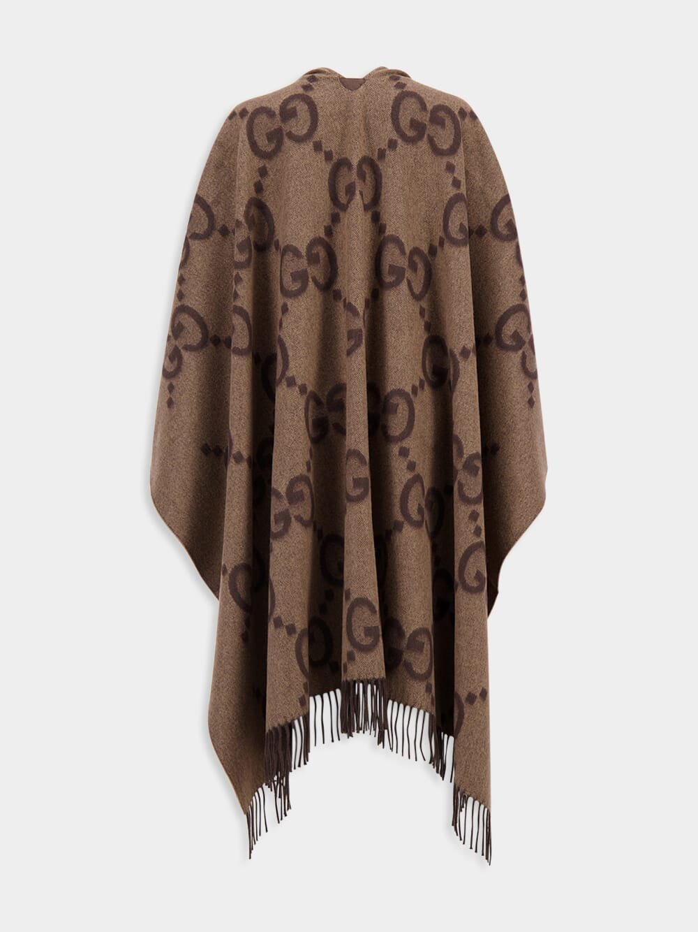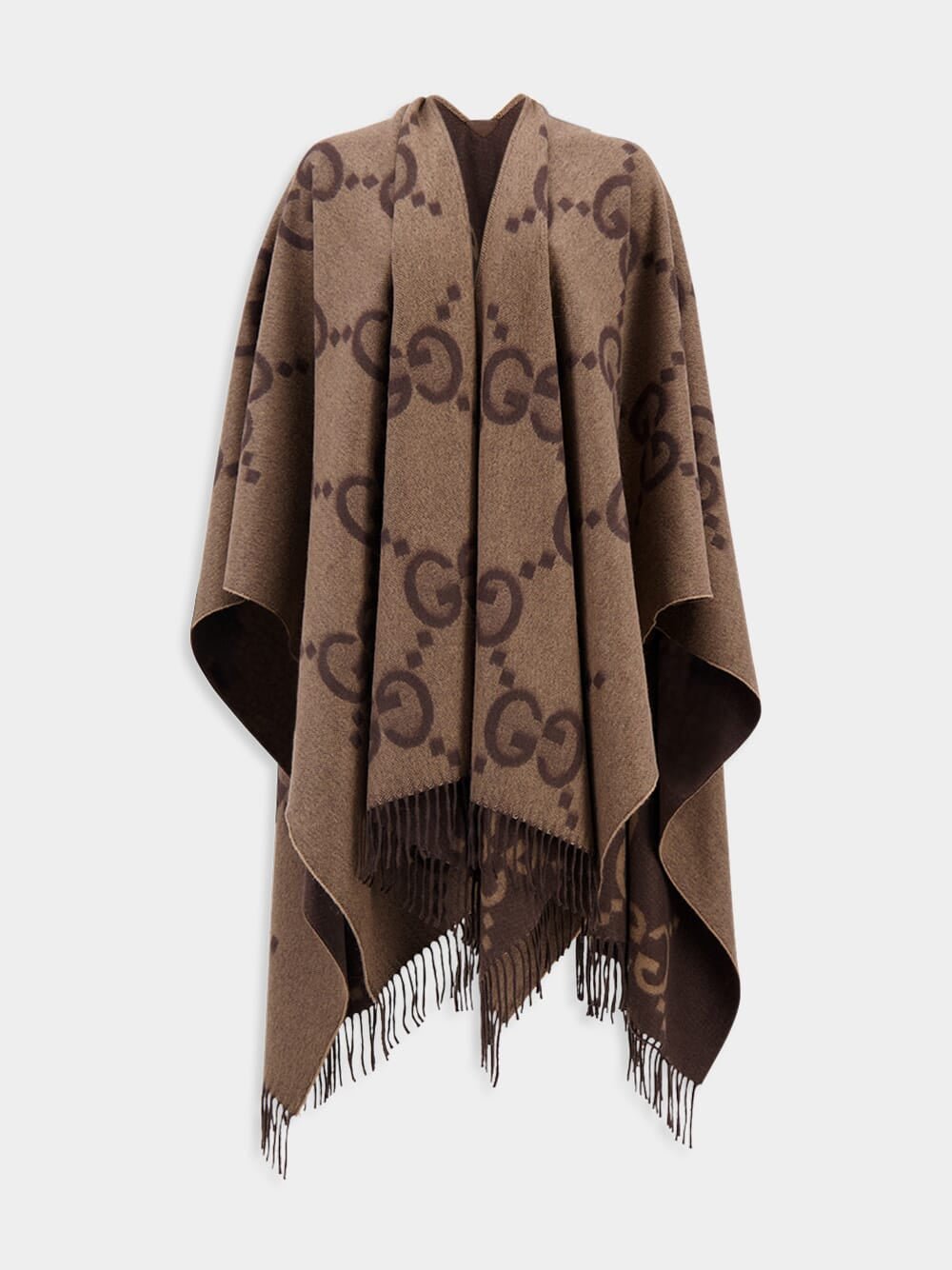 This reversible poncho offers versatility and style with its classic monogram pattern and fringe detailing. One side showcases a bold print, while the other offers a more subdued look, making it an essential and adaptable piece for any wardrobe.