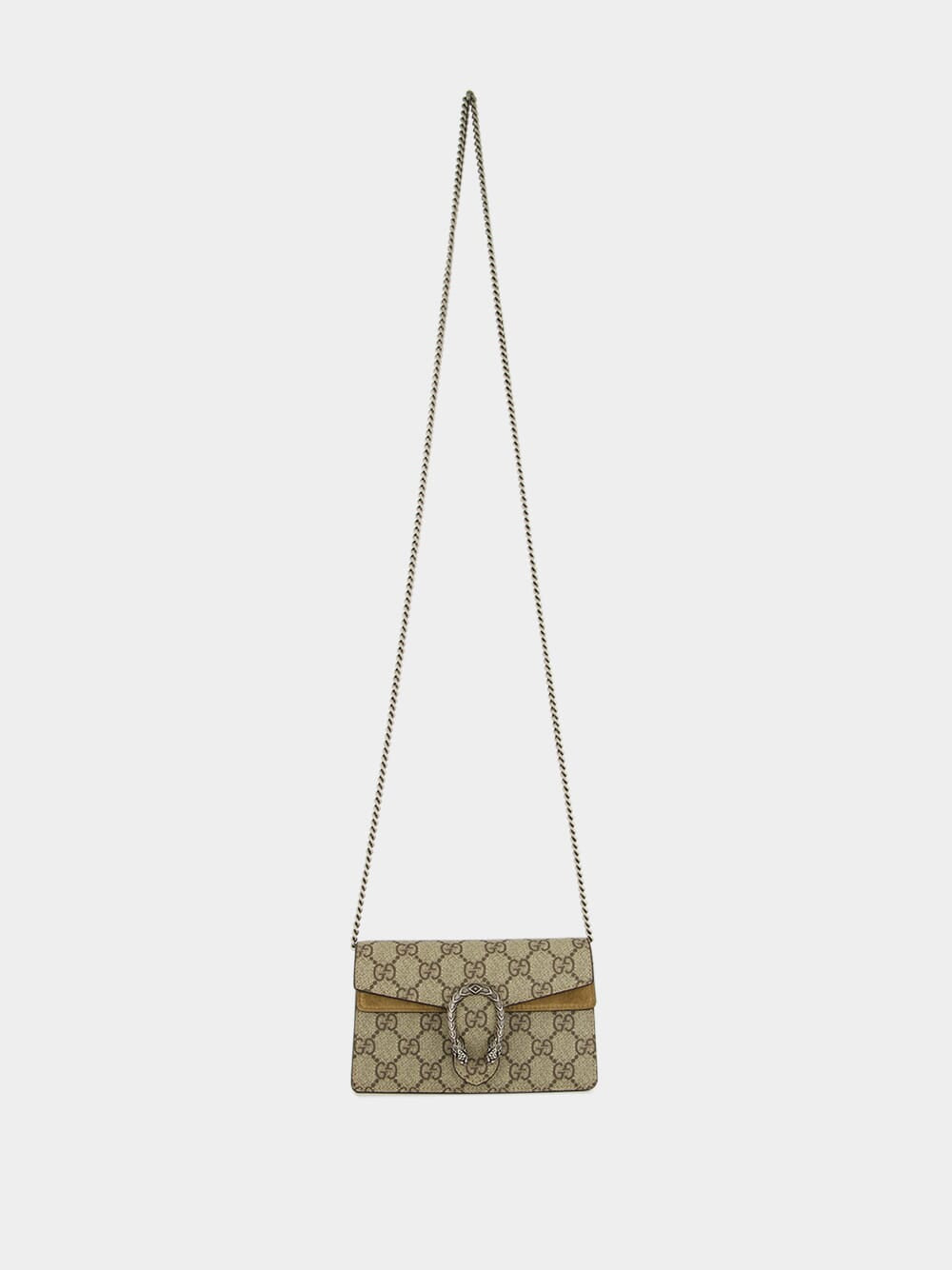 Gucci metallic silver leather super mini Dionysus bag with metal textured tiger head and sparkling Swarovski crystals closure.