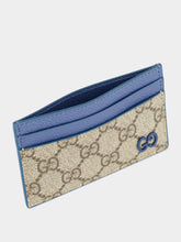 Part of the Pre-Fall 2025 collection, this bi-color card case combines Gucci's signature beige GG Supreme canvas with contrasting blue leather trim. The design is elevated by a ceramic-effect blue GG detail and brass hardware. With four card slots and one open pocket, it offers compact utility in a bold, modern palette.