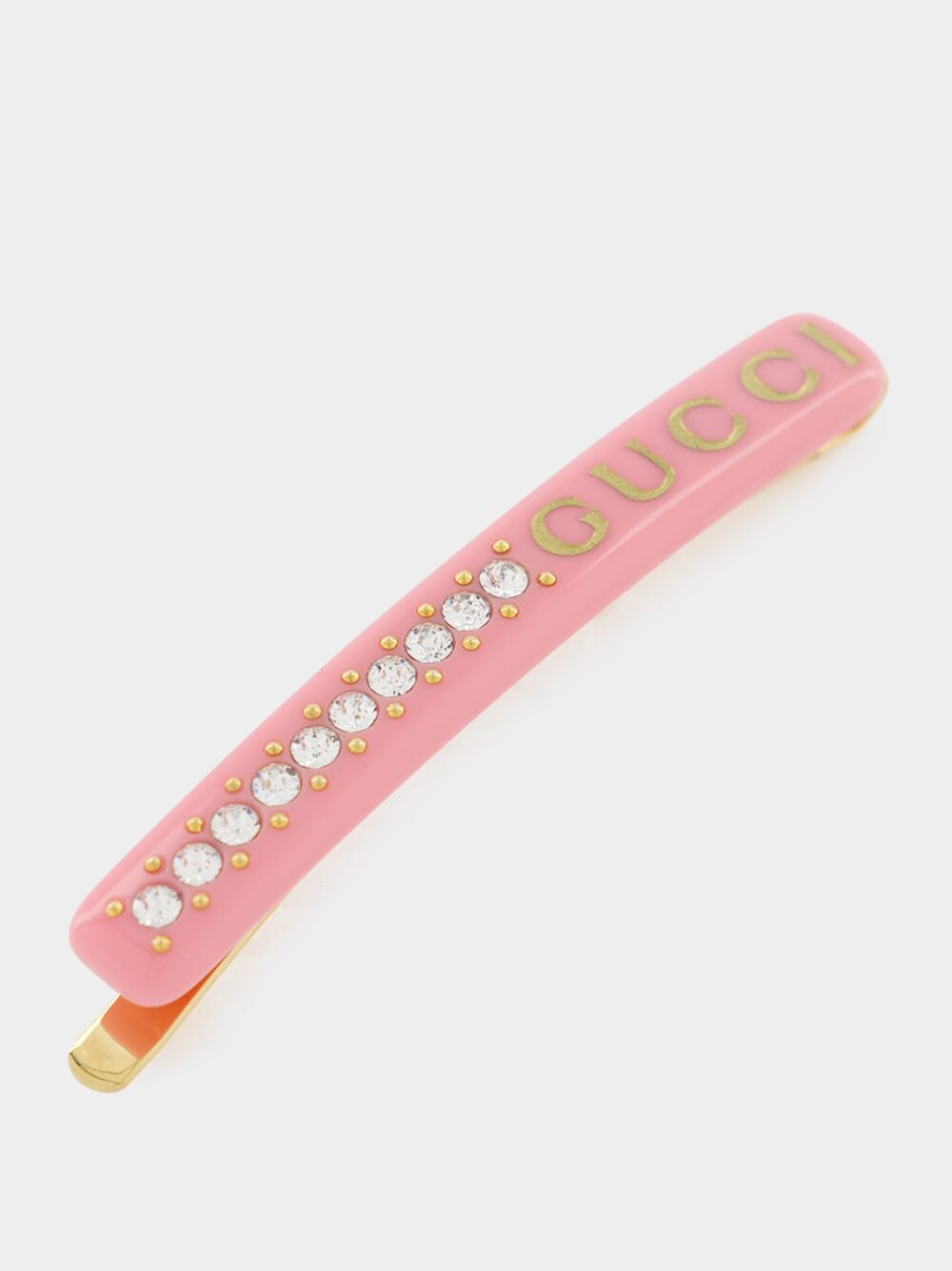Hair Slide With Crystals, a dazzling accessory in pink resin. Adorned with a crystal trim and set on a gold-toned metal base, this metal barrette is a statement piece. The iconic 'GUCCI' logo detail adds a touch of luxury, making it a must-have for effortlessly chic styling.