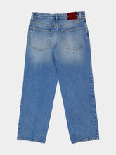 These light blue straight fit denim pants offer a refined silhouette with a casual twist. Made in Italy from certified stonewashed cotton denim, they feature a classic five-pocket design, front crease detailing, and belt loops for a polished yet relaxed appeal. Accented with the distinctive Gucci Rosso Ancora naplak label, they combine quality craftsmanship with effortless elegance—perfect for versatile everyday styling.