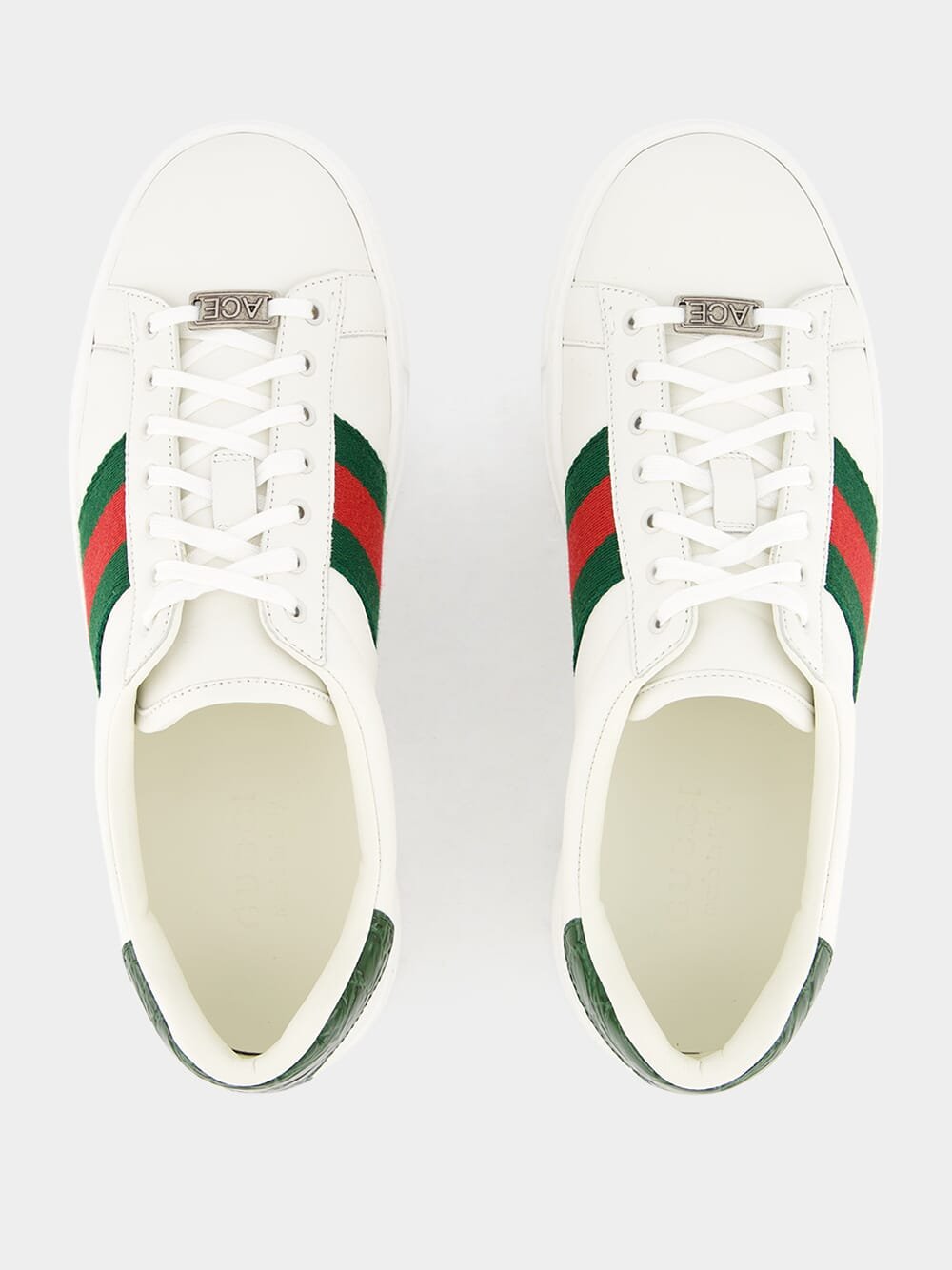 These timeless low-top sneakers are a testament to classic style with a modern twist. The crisp white leather is accented with a signature green and red stripe, creating a striking contrast. Complete with a subtle logo on the heel, they offer a seamless blend of fashion and function, perfect for the trend-conscious with an appreciation for heritage design.