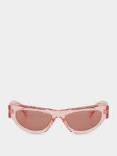 These bold cat eye sunglasses from the Pre-Fall 2025 collection are crafted from shiny transparent pink acetate, detailed with an allover engraved GG motif. The sculptural silhouette is paired with solid light burgundy lenses offering 100% UVA/UVB protection. A striking blend of retro flair and modern elegance, they come with a Gucci Rosso Ancora red case featuring a magnetic closure and white interior.