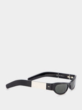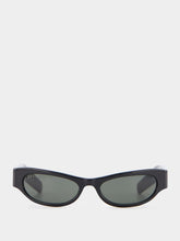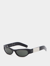Shiny Black Cat-Eye Frame Sunglasses. These chic sunglasses feature a glossy black acetate frame and temples, offering a sleek and sophisticated look. The solid dark grey lenses provide both UV protection and an air of mystery. To top it off, a silver-toned metal plaque with Gucci engraving adds a touch of luxury.