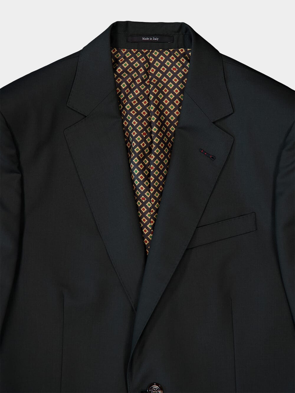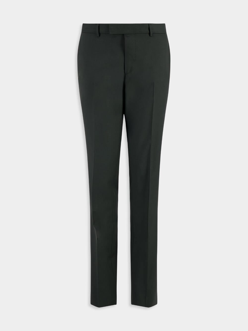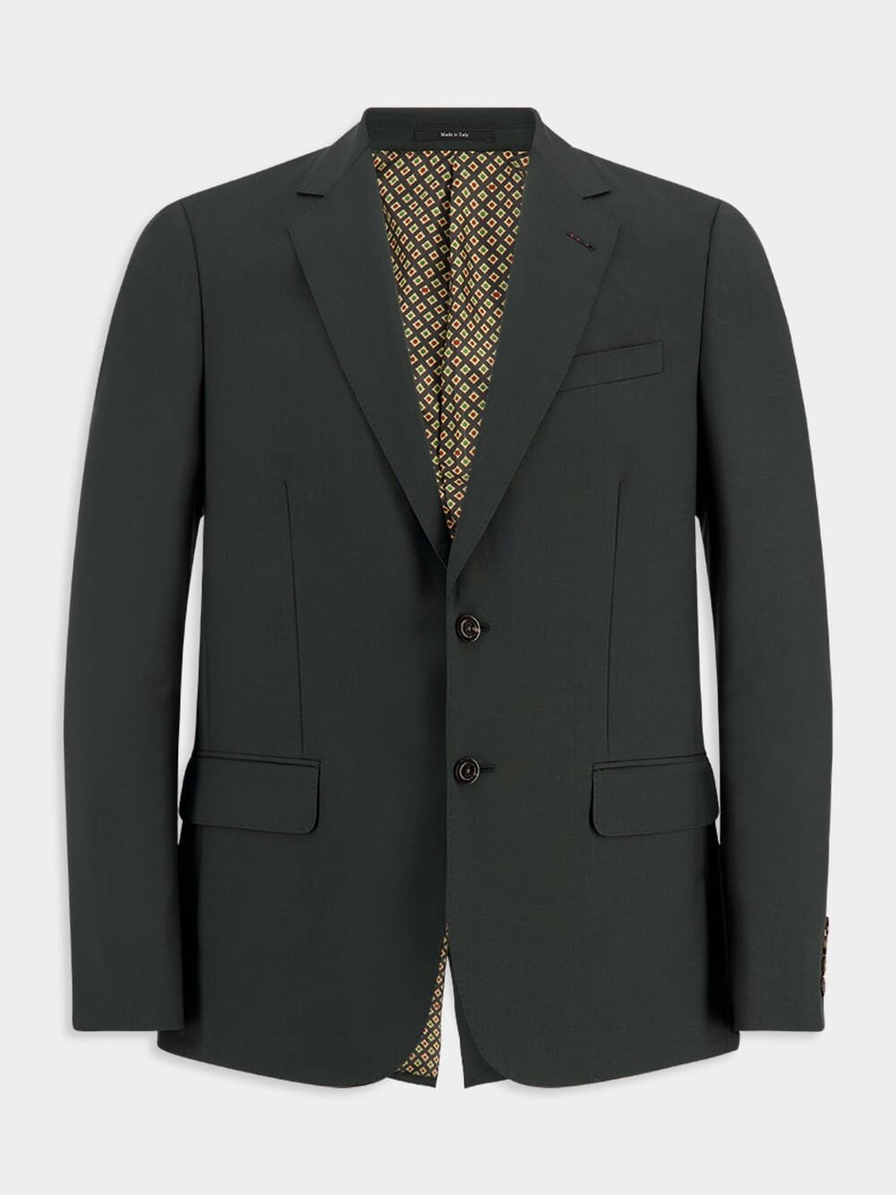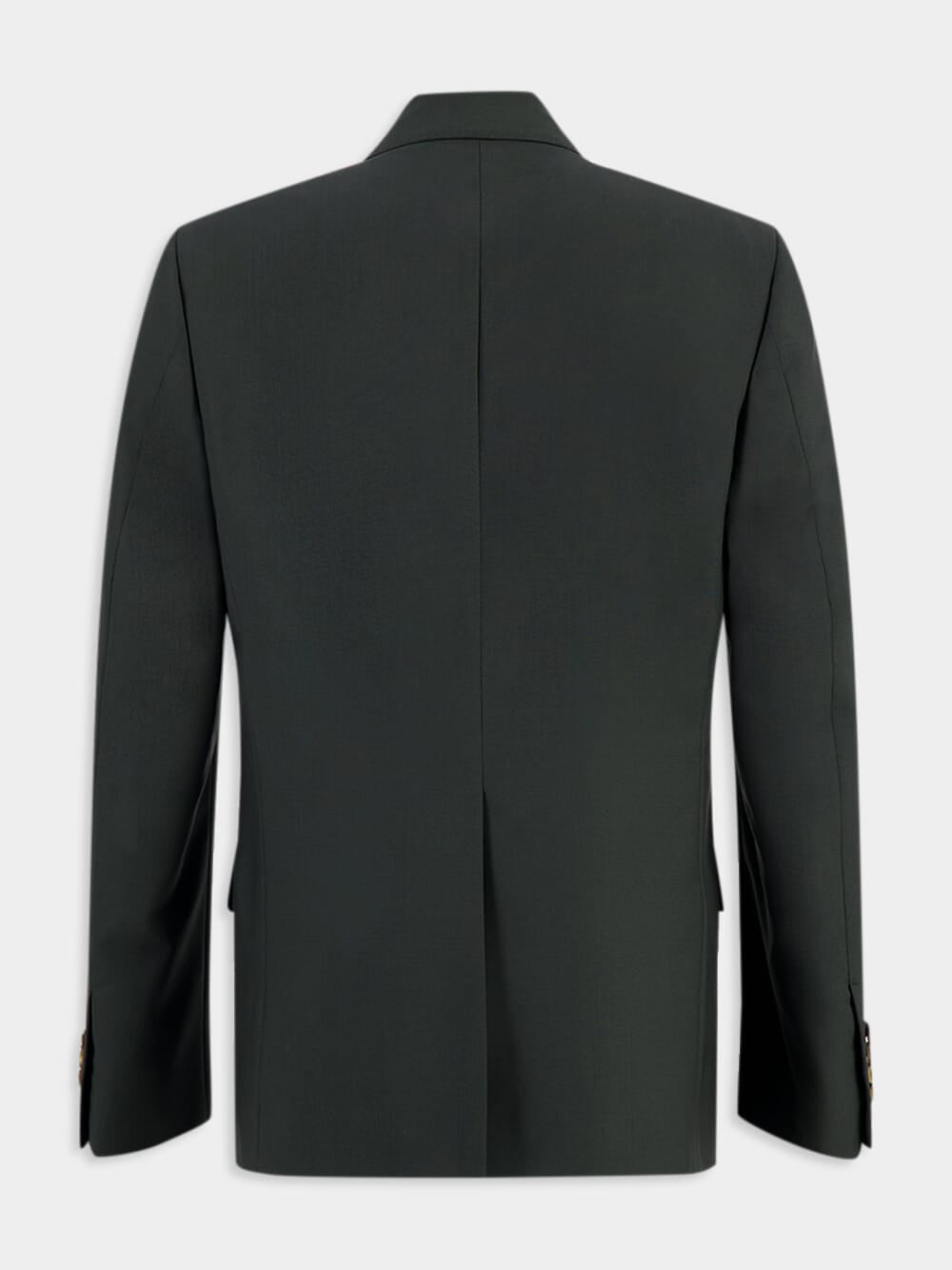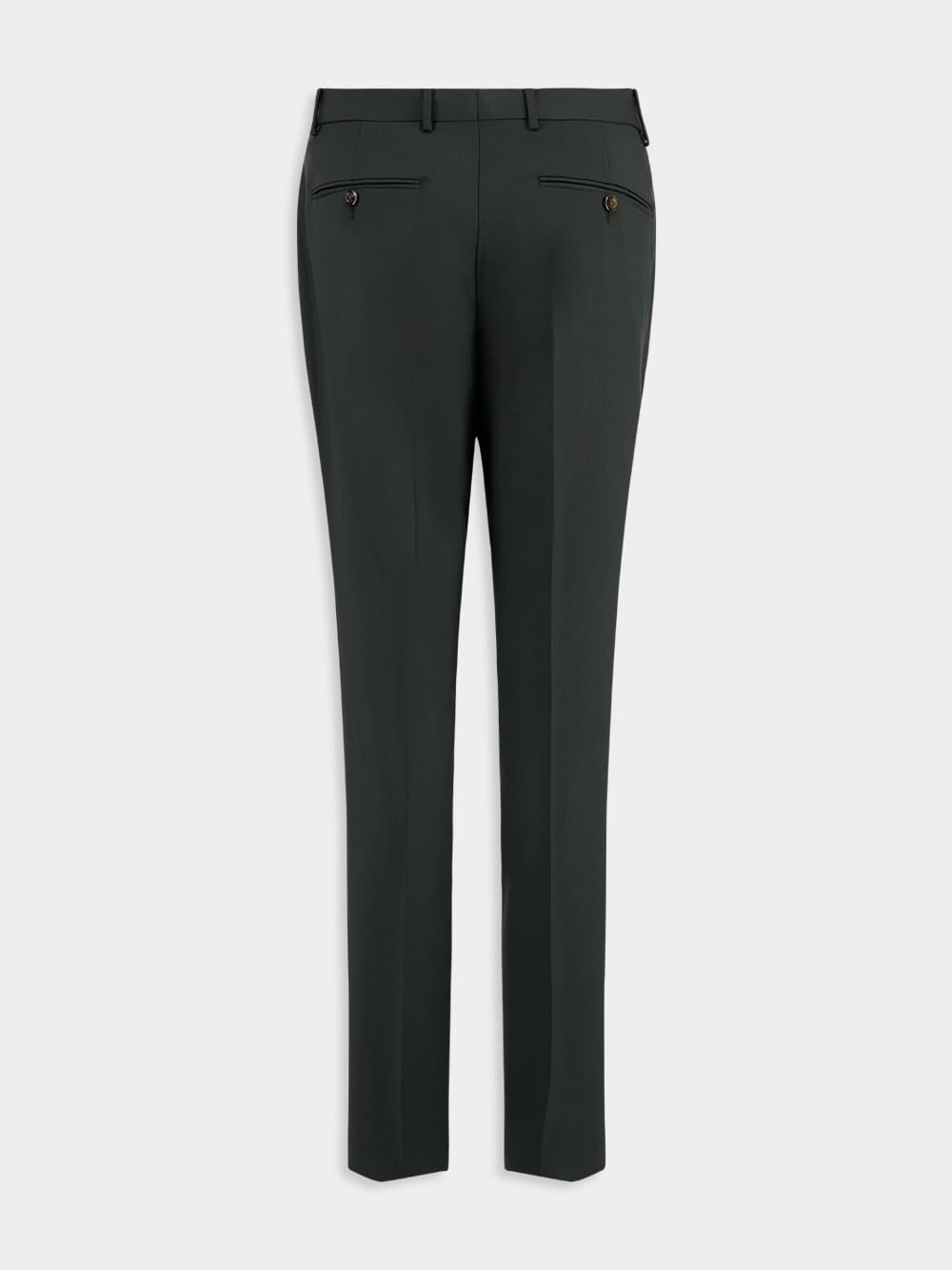 Single-Breasted Dark Green Wool Mohair Suit, a standout choice in a luxurious wool blend. The jacket features a notched collar, front button fastening, long sleeves, buttoned cuffs, chest welt pocket, and two front flap pockets, all elegantly complemented by silk lining. The trousers offer a sleek look with belt loops, concealed front fastening, a slim cut, and convenient pockets, including two side slit pockets and two rear welt pockets.