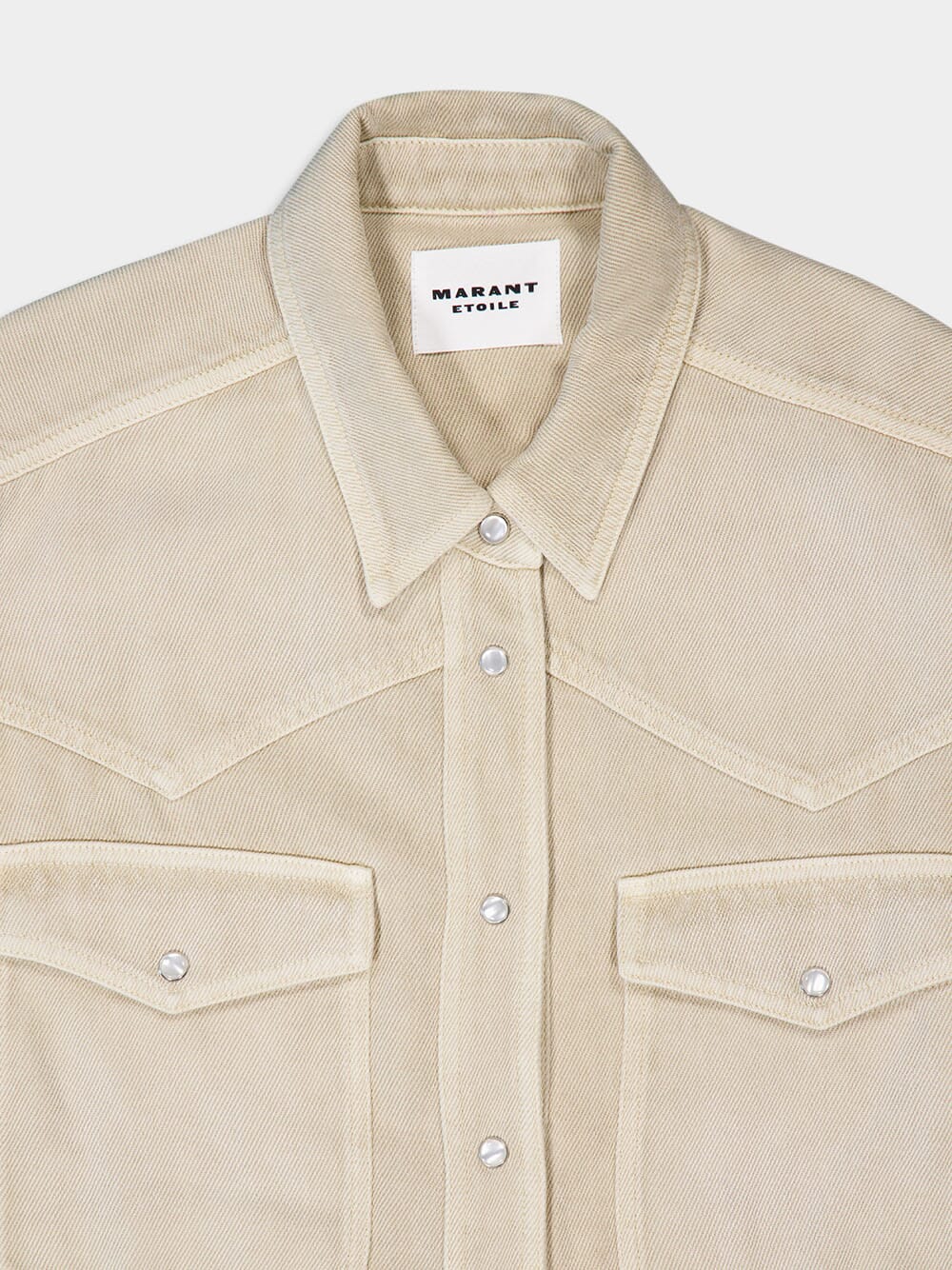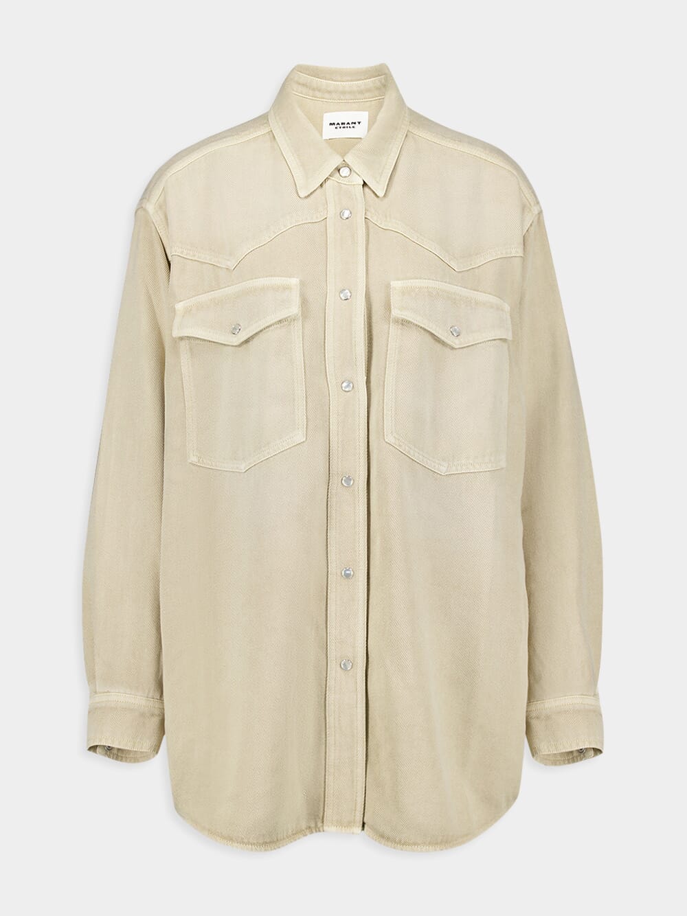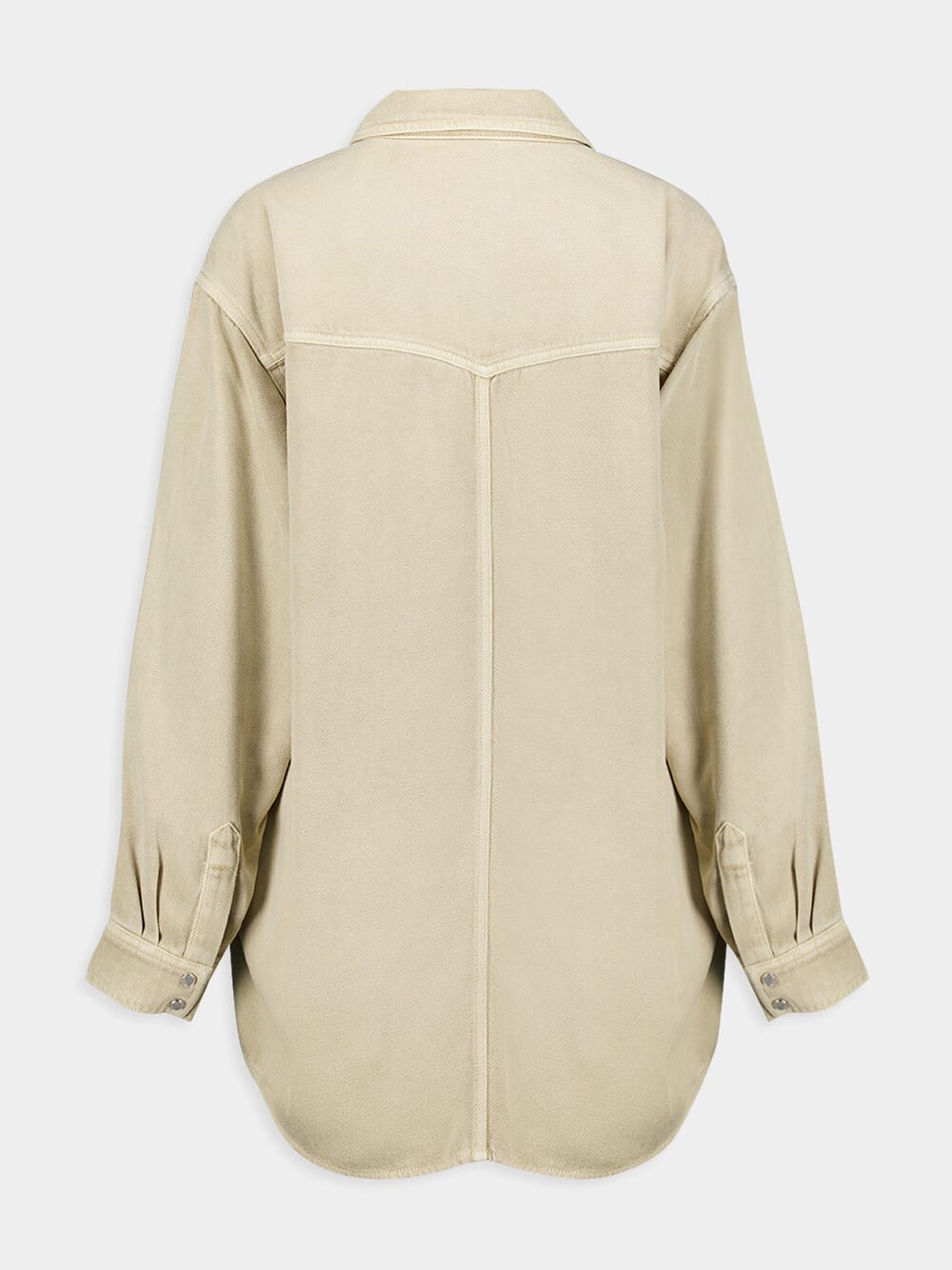 Taniami Denim Shirt, featuring a trendy snap-buttoned front and cuffs. This oversized denim design exudes a vintage-inspired charm, reminiscent of classic menswear shirting elements. Crafted for both comfort and fashion, this shirt is a versatile addition to your wardrobe.