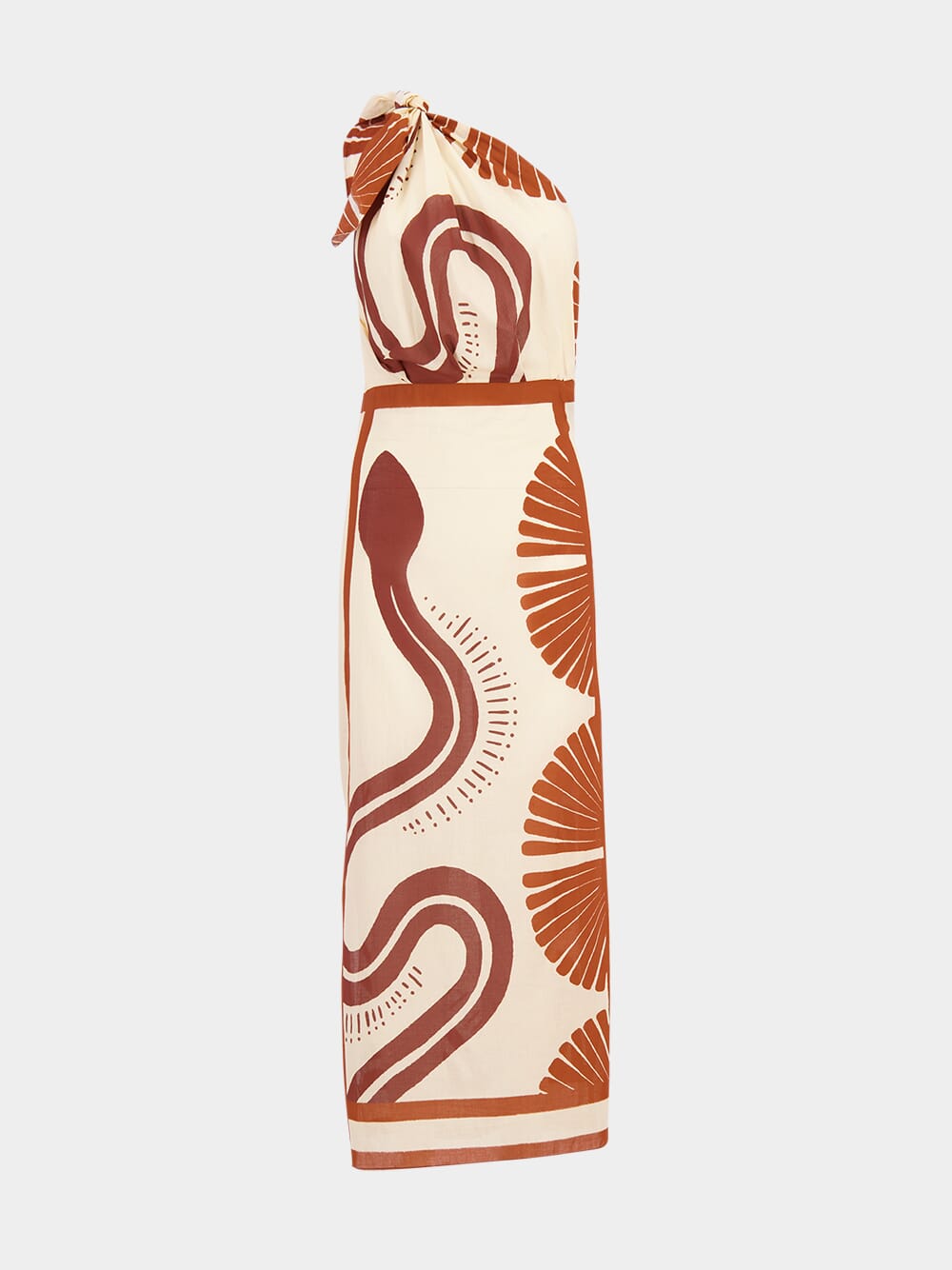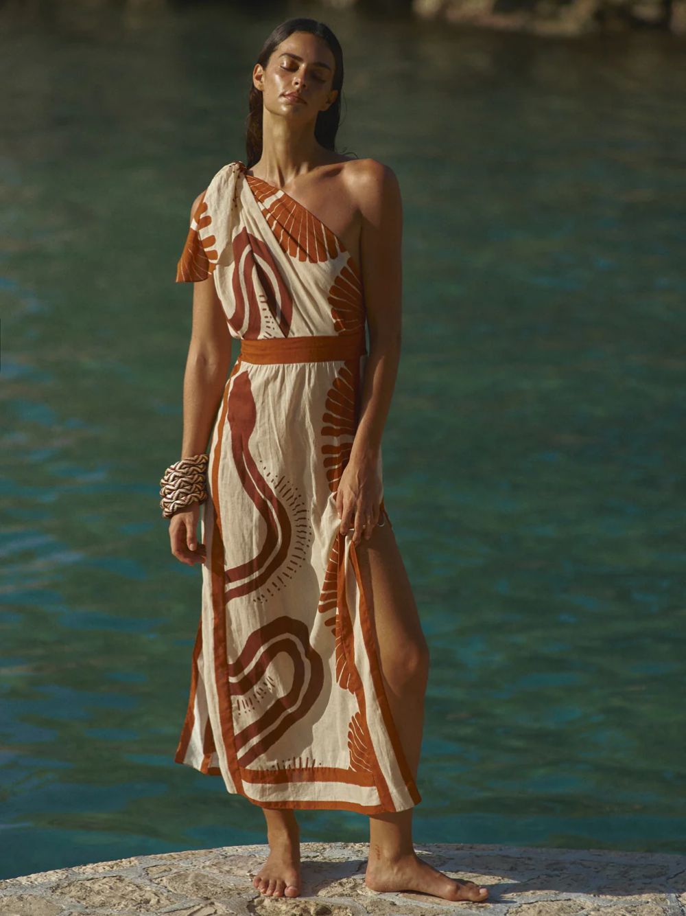 Channel the serenity of nature in this ankle-length voile dress adorned with organic patterns. The one-shoulder design, complemented by a graceful tie detail, offers an airy, chic aesthetic. Ideal for beach escapades or leisurely days, this piece pairs seamlessly with woven sandals and a sun hat for a complete, stylish look.