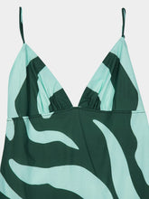 The Zea Palm Dress is a flowing maxi silhouette crafted from lightweight cotton poplin. Featuring a bold geometric print in dark green and mint, it is designed with a softly gathered empire waist and delicate adjustable straps for a custom fit. With a breezy full skirt and easy slip-on closure, this dress combines effortless comfort with striking visual appeal — perfect for sun-drenched escapes and elegant summer moments.