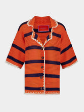 This short-sleeved Salt’n’Vinegar jacket by La DoubleJ is a vibrant statement piece, crafted in intricate crochet with a bold bicolour palette of orange and navy—predominantly orange. Featuring a boxy silhouette, buttoned front, and structured collar, it captures a retro spirit with artisanal flair. Ideal for layering, it adds texture and playfulness to warm-weather ensembles.