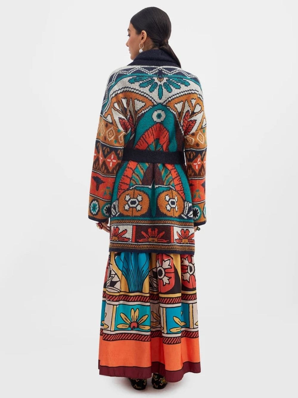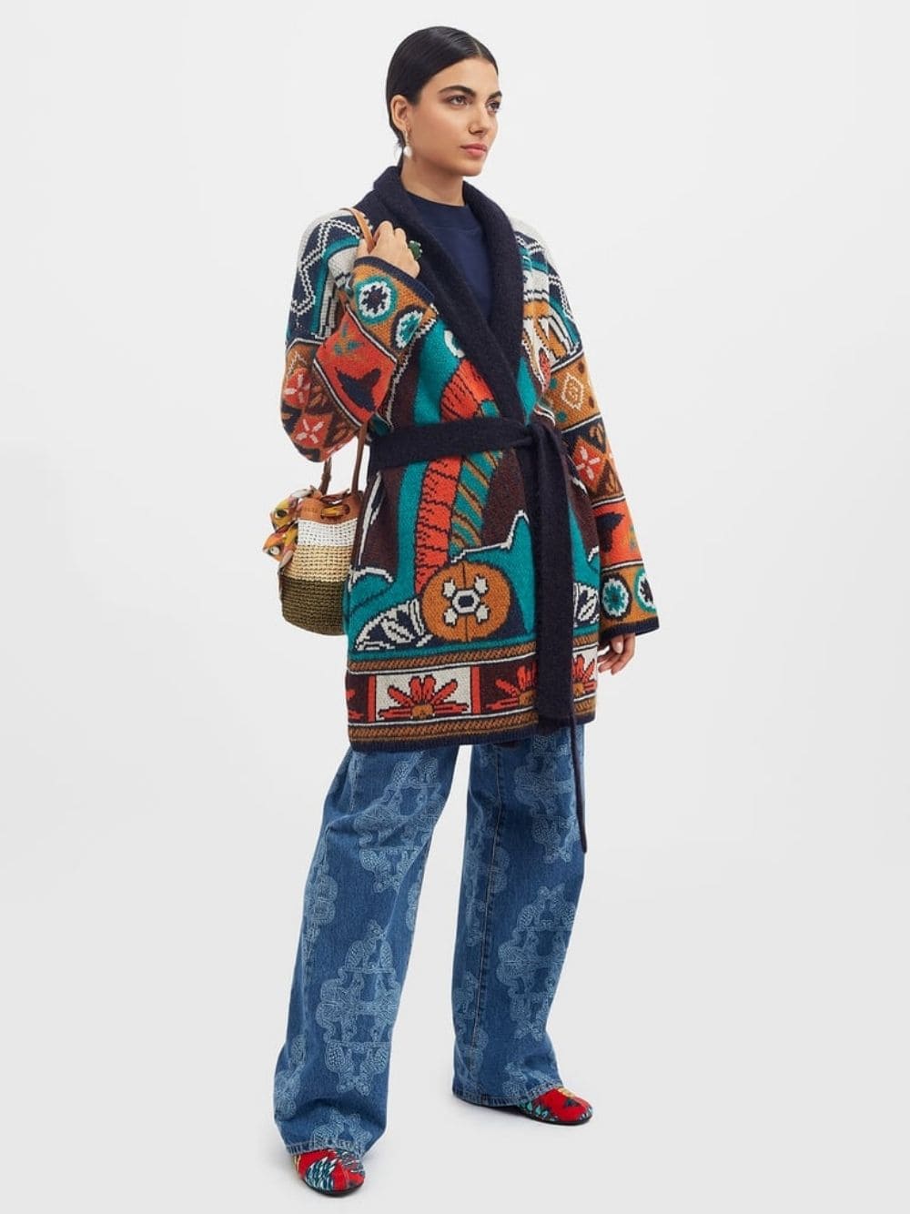 Philae Placée Wool Cardigan, expertly crafted from a luxurious blend of Merino and cashmere. This cardigan features a removable sash and convenient pockets for both style and practicality. With a solid collar and a hand-placed print across the front and back, it's a true fashion statement. Designed to hit below the hip, this cardigan is the perfect addition to elevate your style and keep you warm in style.