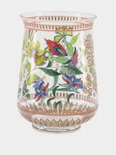The "Indian Flowers" large tumbler by Peter Rath (1993) is an ornate piece of lead-free crystal, meticulously hand-painted with vibrant floral motifs and intricate detailing. Inspired by Indian decorative traditions, the tumbler's bold patterns and warm tones evoke exotic elegance. Ideal for elevating everyday moments or enhancing a refined table setting with a touch of artistic heritage.