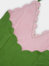 The Broadway Maillot swimsuit offers timeless elegance with a contemporary touch. Crafted from Italian basketweave fabric, this green one-piece features structured seams for a form-flattering shape and a halter neckline with an adjustable tie. The plunging low back and signature raw-edge scalloped trim add a refined edge. Fully lined and quick-drying, it provides moderate support and coverage, making it perfect for sun-soaked days.