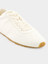 These ivory Plume sneakers by Miu Miu are crafted from supple nappa lambskin leather for a sleek, ultralight profile. Designed for everyday versatility, they feature a perforated upper, flat laces, and a rubber sole with a lug tread. Signature screen-printed logos on the tongue and heel add a distinctive touch, while the removable leather-covered insole ensures comfort and practicality.
