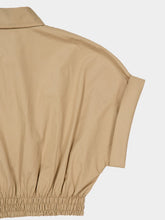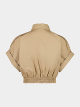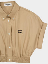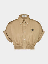 The Kaki Cropped Cotton Poplin Shirt by Miu Miu merges crisp tailoring with a youthful silhouette. Made from lightweight poplin cotton, this short-sleeve shirt features a cropped cut and an elasticated hem that creates a gently gathered effect. The soft beige tone enhances its versatility, making it an elegant yet casual choice for warm-weather styling with a refined twist.