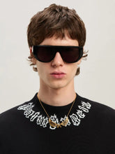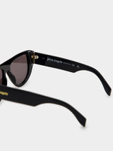 The Joshua sunglasses redefine the classic mask frame with a sleek, modern silhouette. Designed for a snug fit, they feature a bold single top bar that enhances their distinctive shape. The black acetate frame seamlessly integrates with dark grey round lenses, offering a refined yet edgy aesthetic. Tonal Palm Angels logo engraving on the temples adds a signature touch. A statement accessory for those who embrace contemporary luxury.