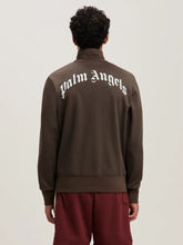 This brown zipped track jacket by Palm Angels combines a sporty silhouette with bold branding. Crafted from lightweight polyester, it features a high collar, ribbed cuffs, and hem for a structured fit. The standout feature is the iconic curved Palm Angels logo printed on the back, adding a statement touch to this versatile piece.