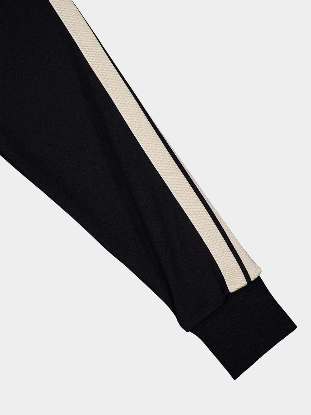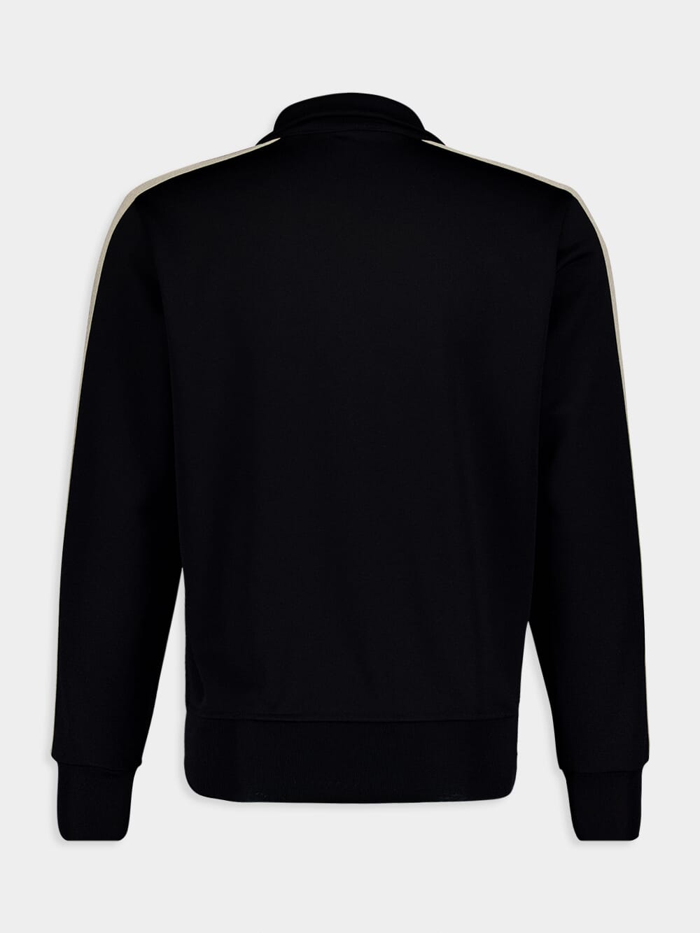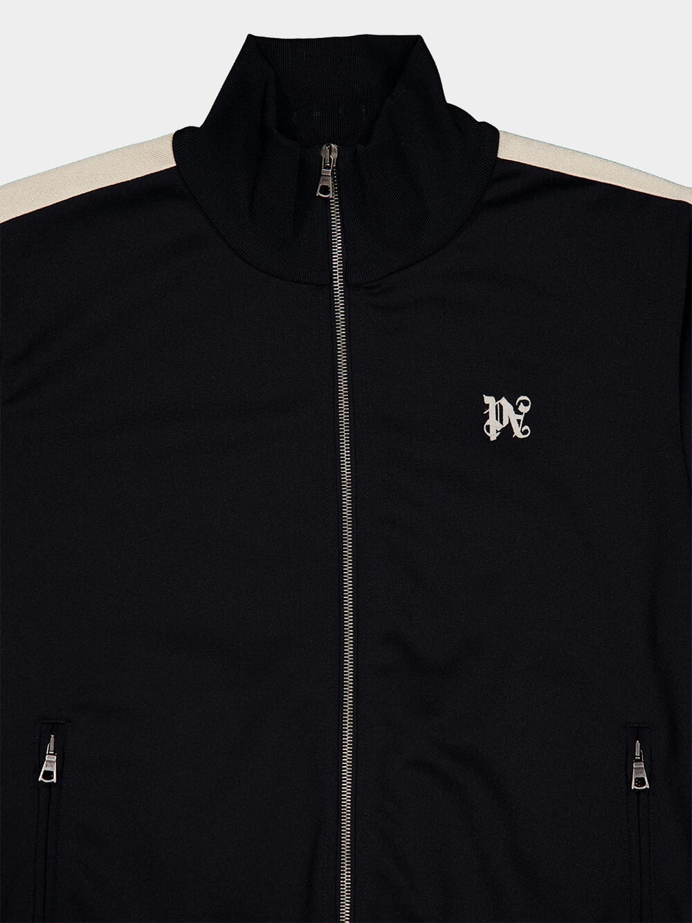 A modern take on the classic track jacket, this piece features a sharp monochrome palette with distinctive white piping. The subtle monogram adds an air of exclusivity, while the zippered pockets bring functionality to its sleek style.