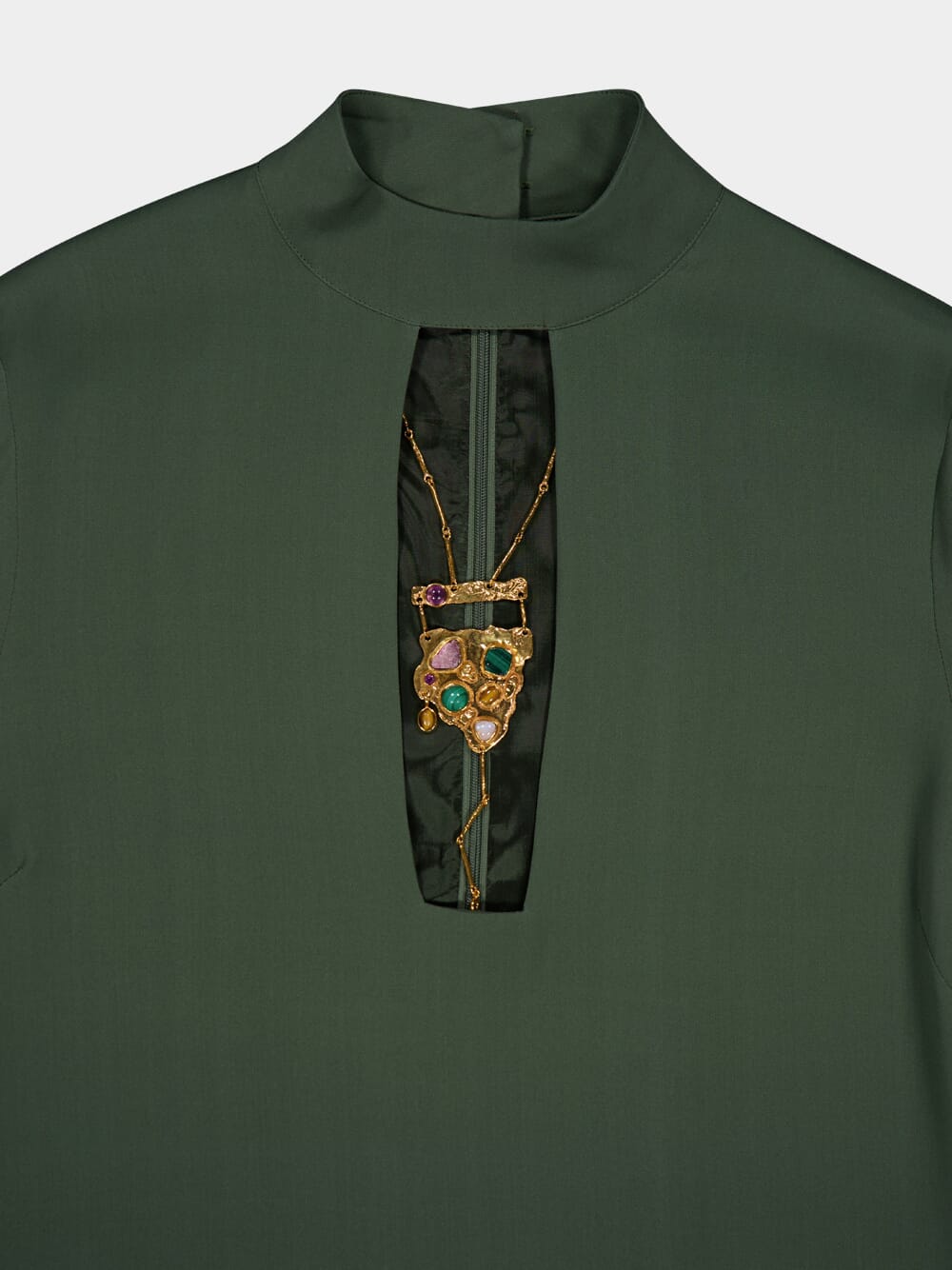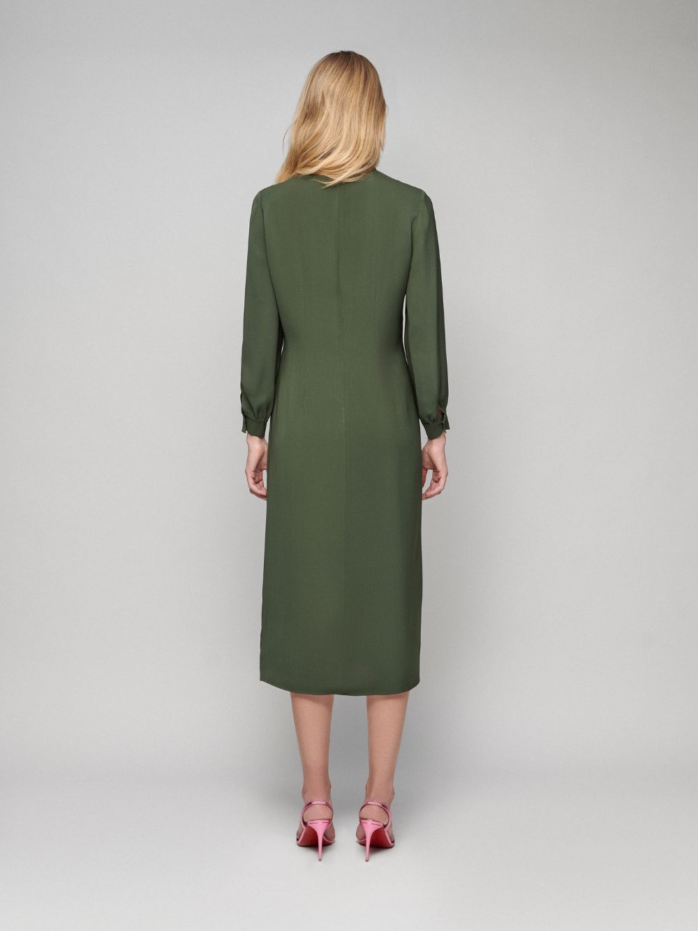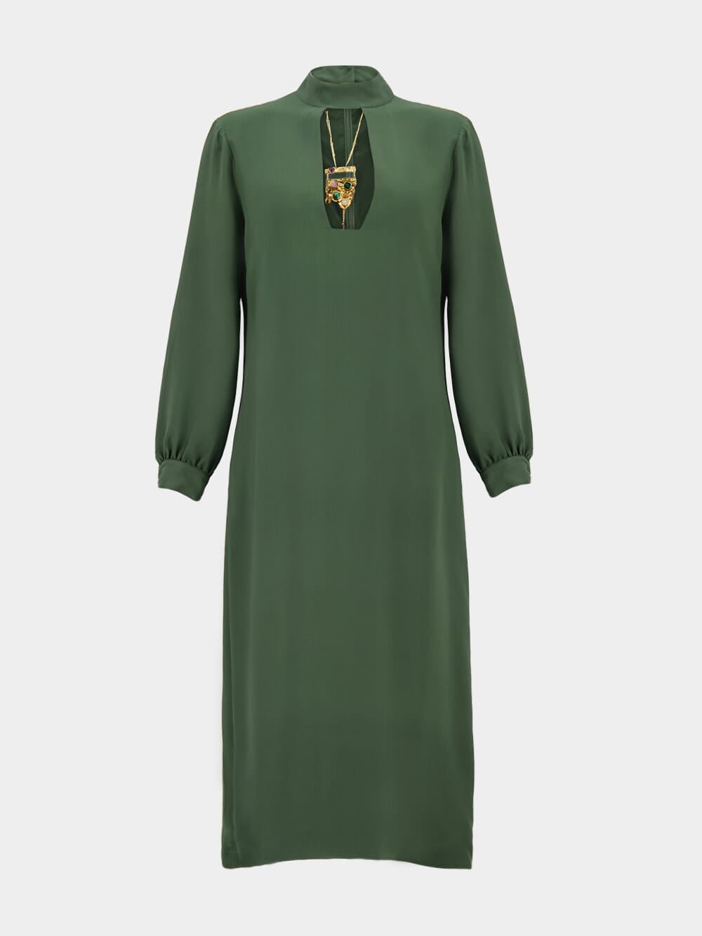 Hermes Silk Dress with Jewelry Necklace - a timeless blend of luxury and elegance. This dress features a captivating necklace detail that perfectly complements the dress's chic design. The buttoned-cuff sleeves add a touch of sophistication to this piece.