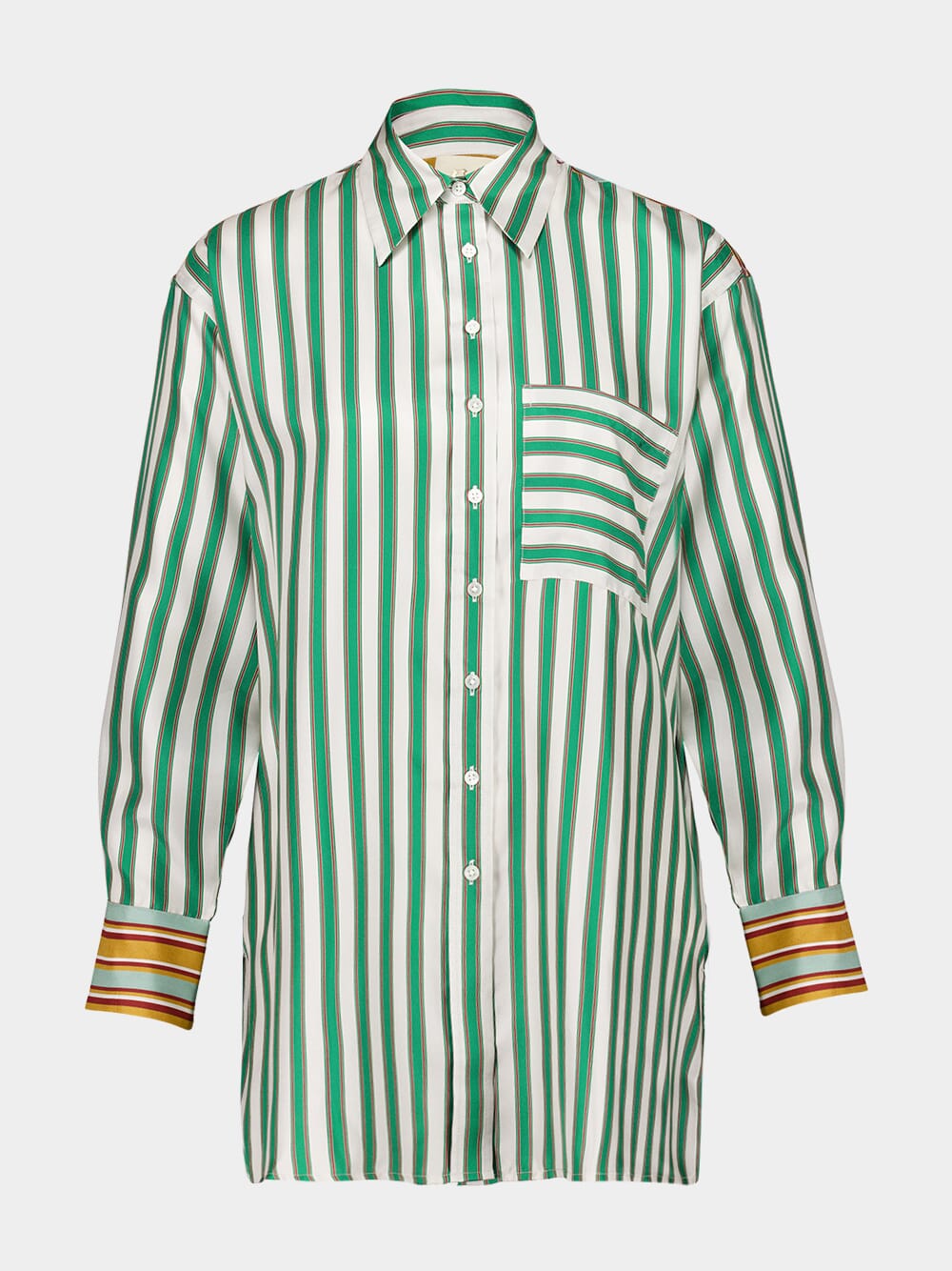 A celebration of colour and movement, the Sonia Multi Stripes Silk Twill Pants bring a playful duality to tailored dressing. Crafted from 100% silk twill, the front features crisp green and white stripes, while the back reveals a vibrant array of mustard, orange, and rust tones. The high-waist and wide-leg silhouette create fluid elegance with unexpected charm. Made in Portugal.