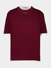 This Amaranth Red T-shirt redefines a casual essential with its layered construction and bold contrast hem detail in Maize Yellow. Crafted from 100% cotton jersey, it features an oversized, boxy fit with a ribbed crew neck and short sleeves. Finished with Prada’s tonal fabric triangle logo and sartorial label, this elevated staple combines dimension, comfort, and contemporary design.