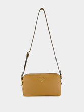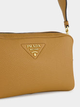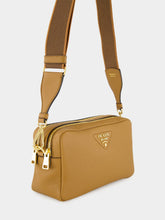 This Prada crossbody bag in caramel-toned soft leather blends function and elegance with a compact silhouette. Featuring two zipped compartments for practical organisation, it is adorned with the iconic enameled metal triangle logo. The wide logo-print fabric strap adds a sporty-chic contrast while ensuring comfortable wear. Ideal for daily use, this Italian-crafted piece offers contemporary luxury with timeless appeal.