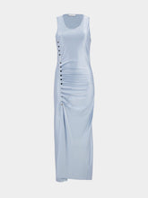 This ethereal dress, crafted from four layers of gazar and voile, drapes the body in sheer elegance. Its sleeveless design and flowing fabric embrace a new kind of fluidity, accented with delicate touches. The dress features a round neckline, a scarf collar for added grace, and a sleek, enameled metal triangle logo. A concealed back zipper and snaps ensure a seamless finish, while the straight hem and straight fit silhouette maintain a sophisticated profile.
