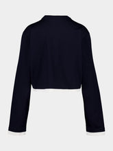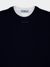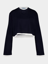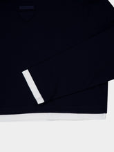 This navy long-sleeved cotton jersey T-shirt features a contemporary layered design with contrasting trims at the neckline, sleeves, and hem. The boxy silhouette adds structure and ease, while the tonal triangle logo gives a refined brand signature. A versatile essential for effortlessly elevated casual styling.