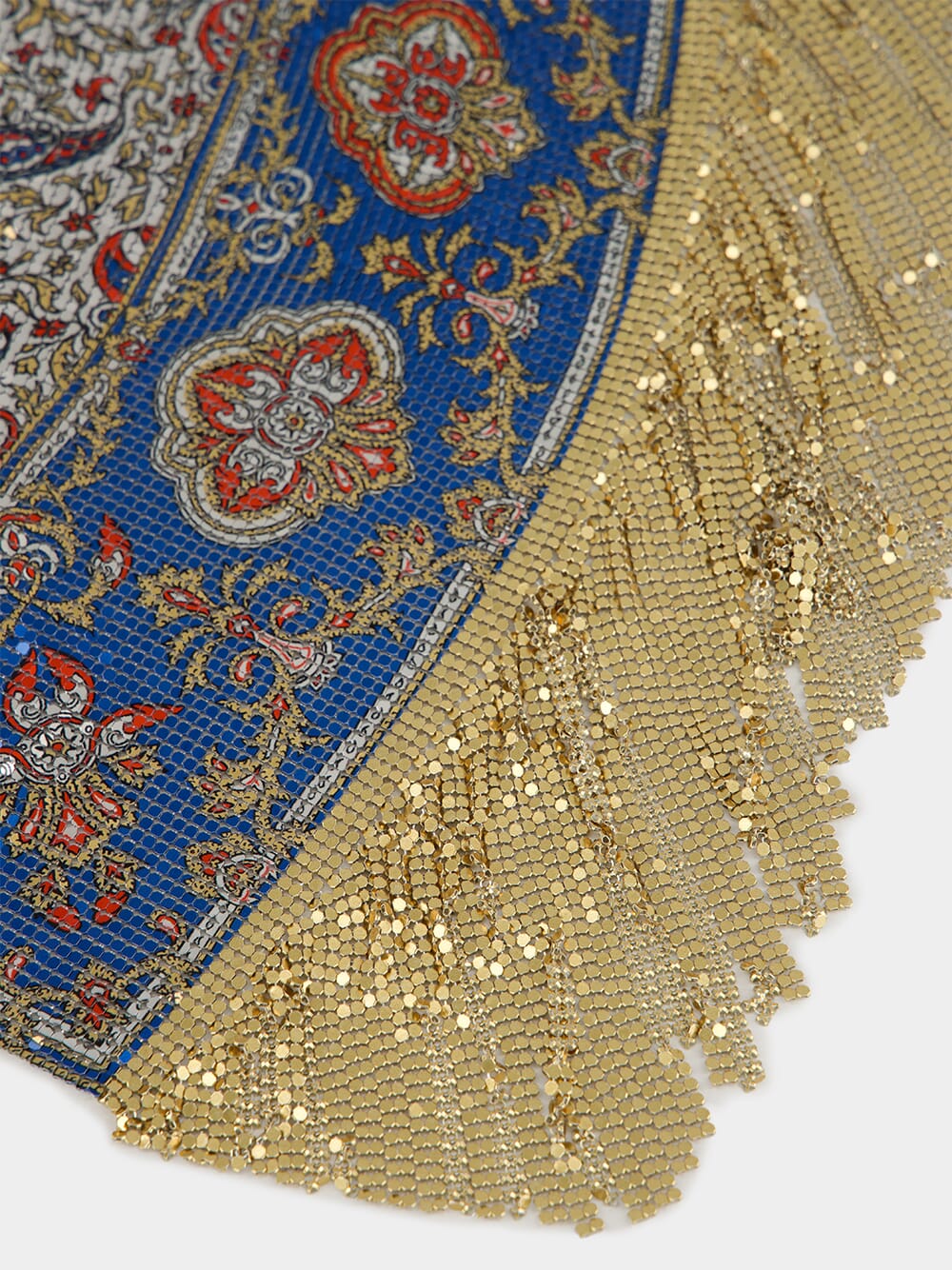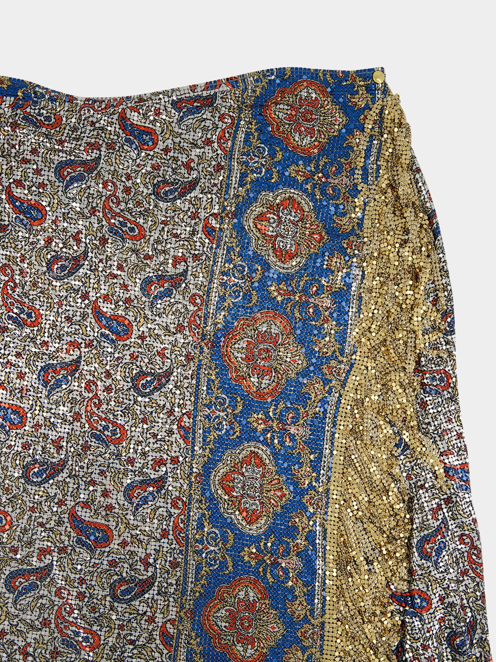 This statement long skirt by Rabanne captivates with its fluid silhouette and shimmering finish. Crafted in metallic mesh with a Bandana Paisley print in silver, burgundy, and blue, it features a thigh-high slit and is elegantly trimmed with golden fringes. A bold, floor-length design that adds high-impact glamour to eveningwear or artistic styling.