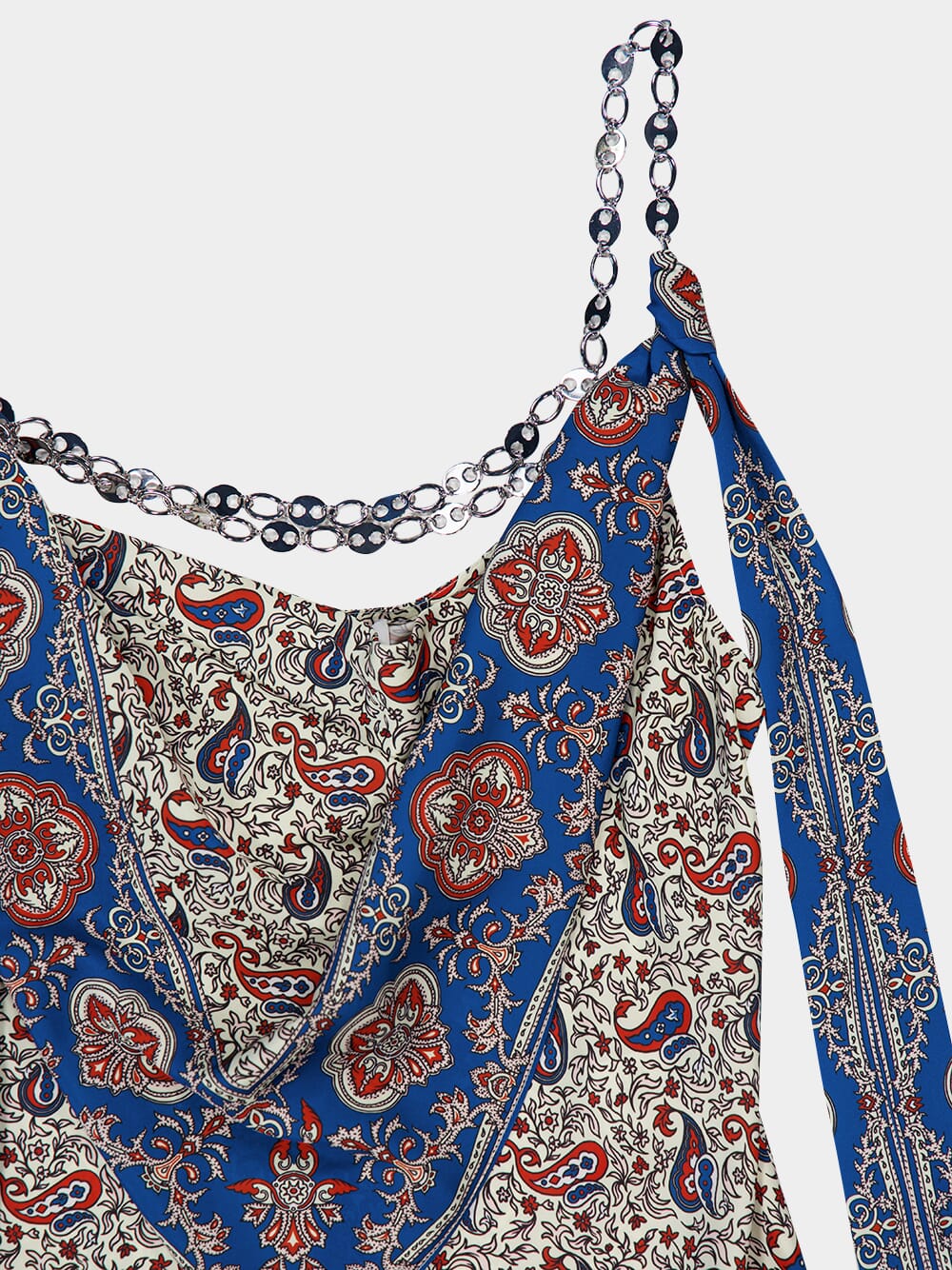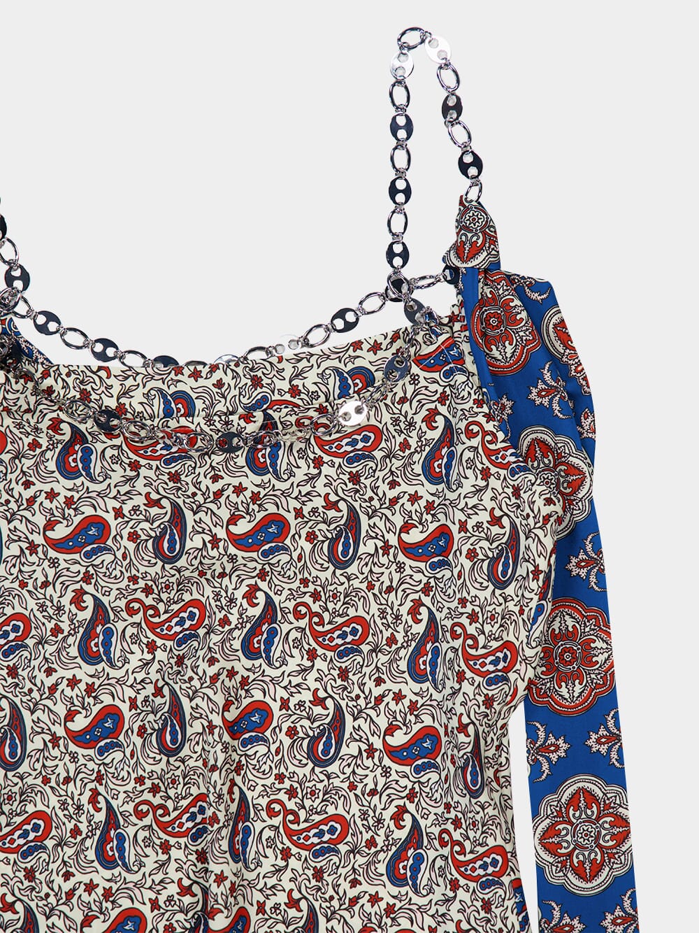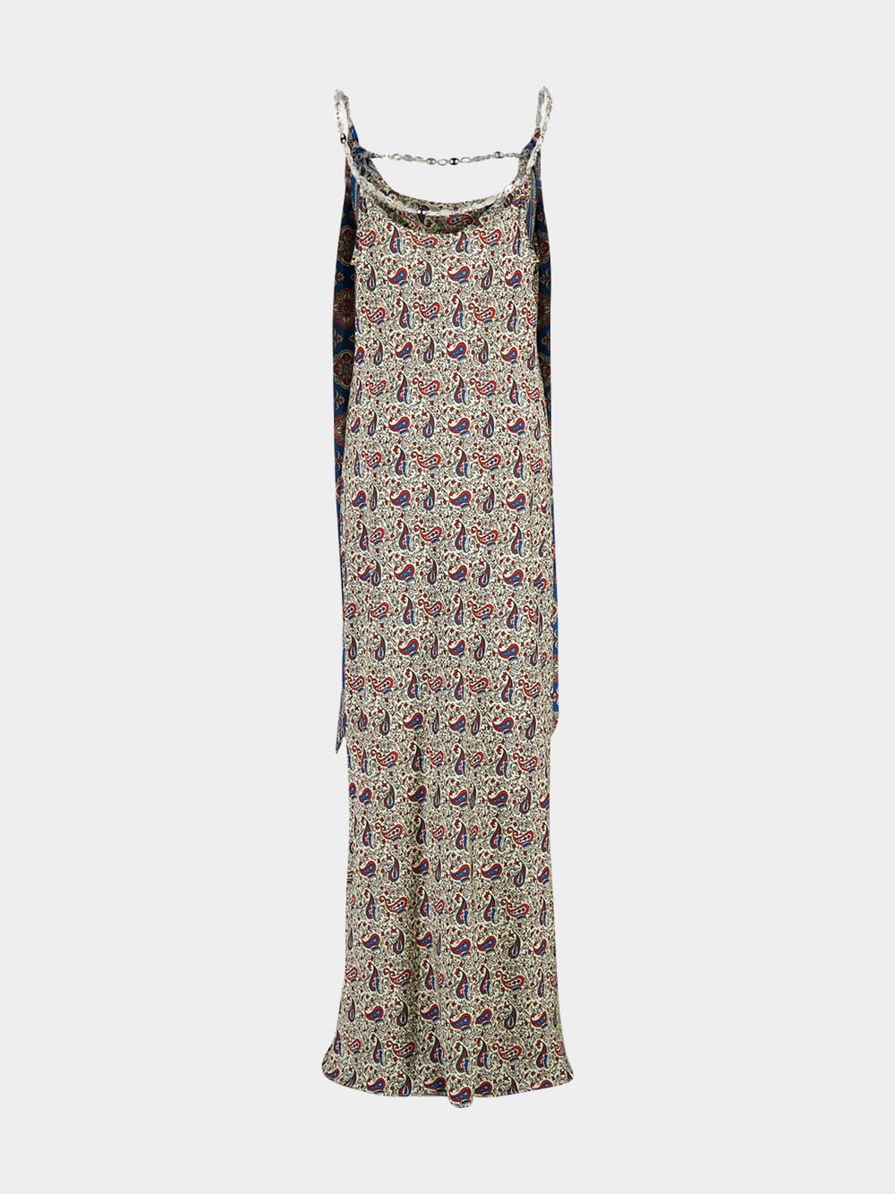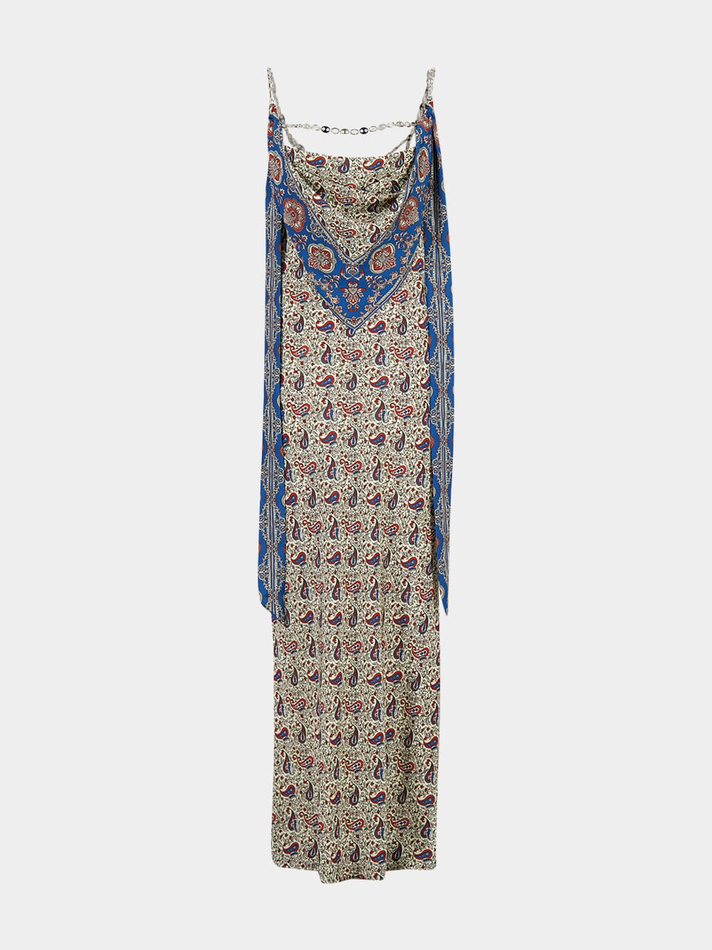 This Printed Satin Maxi Dress by Rabanne features a striking Bandana Paisley motif in cream, burgundy, and blue. Designed with a graceful cowl neckline and delicate gold chain straps, the sleeveless silhouette falls to an ankle-length hem. Crafted in satin, it brings a luxurious drape and bohemian elegance to any summer occasion.