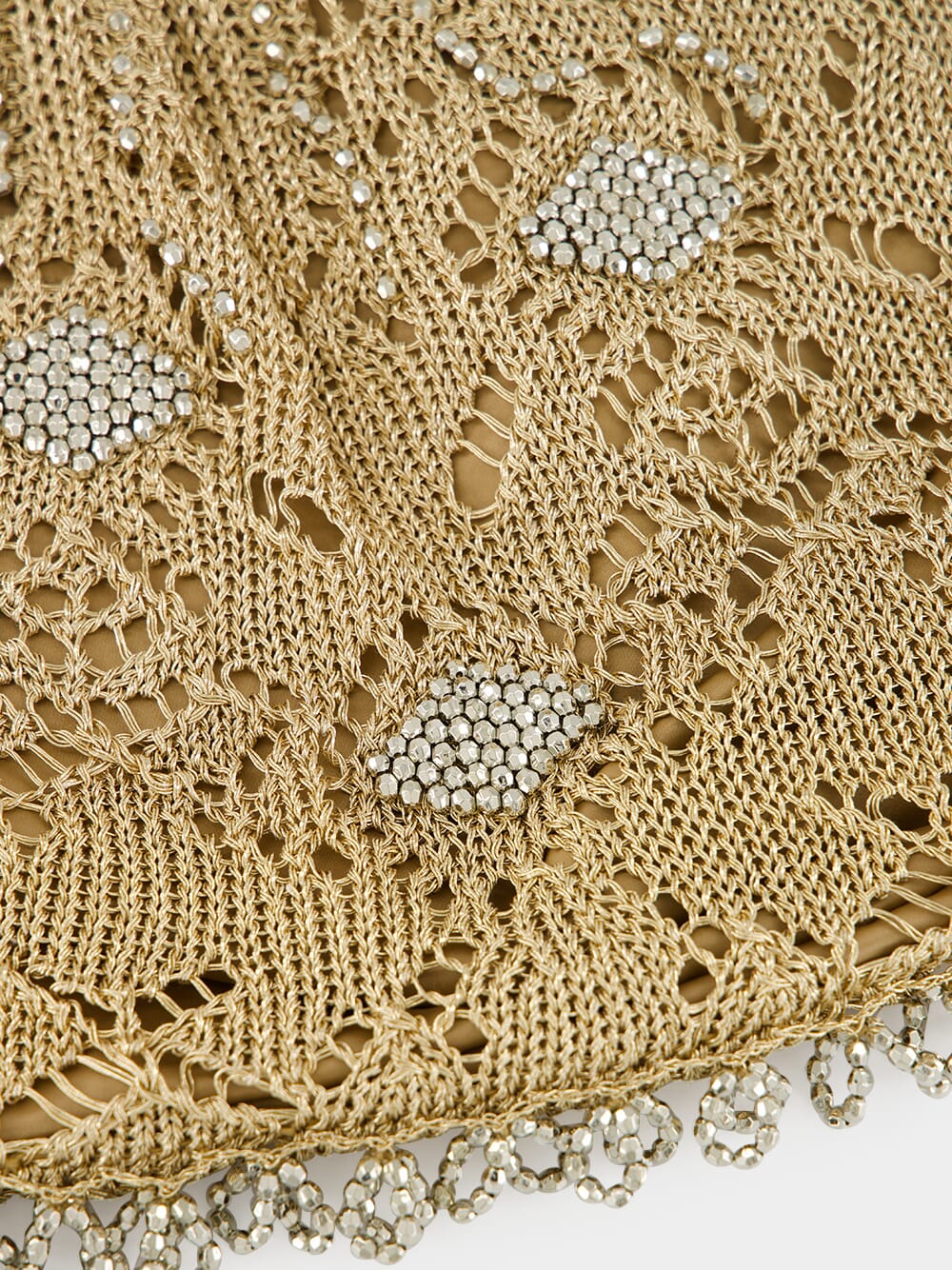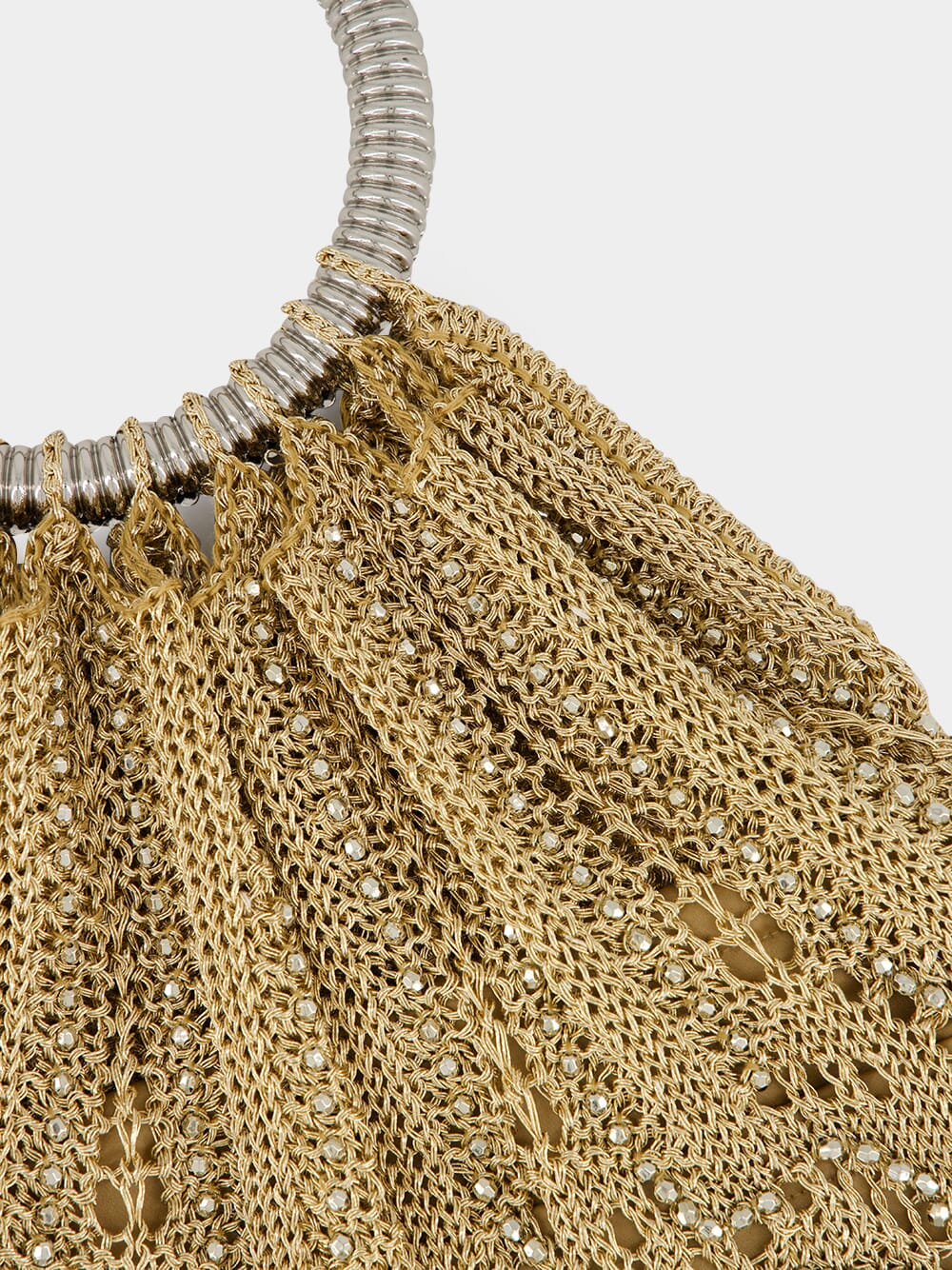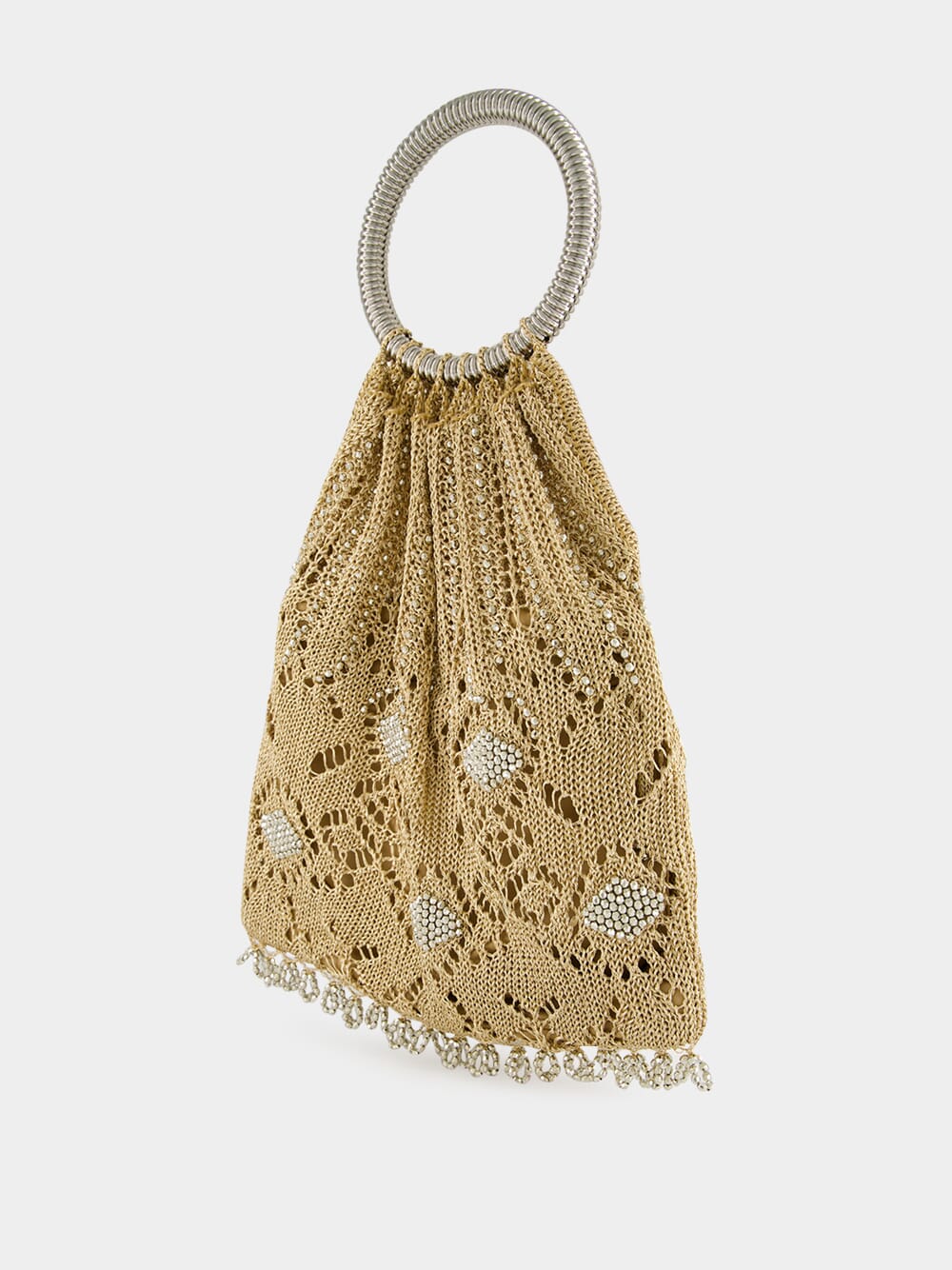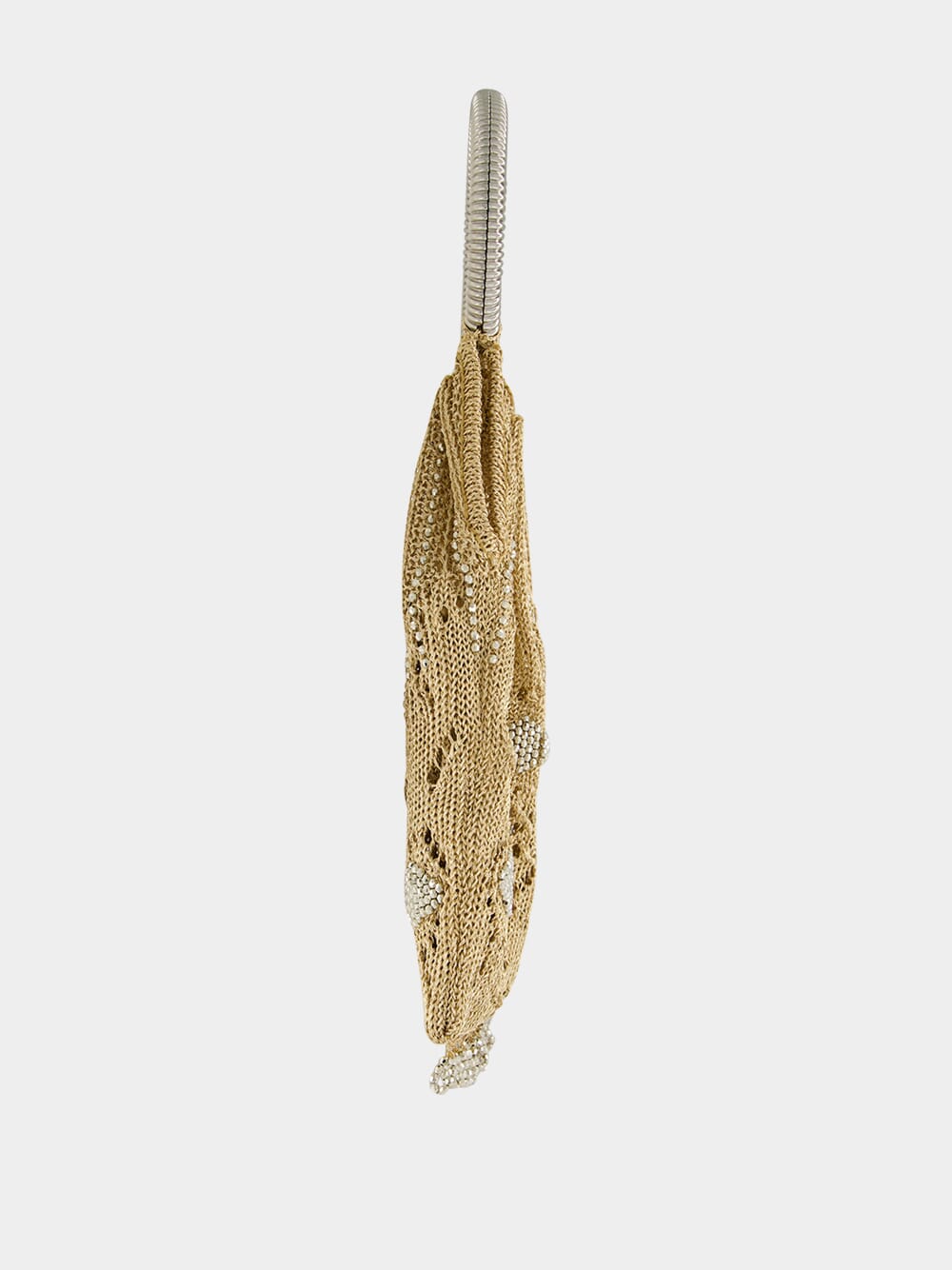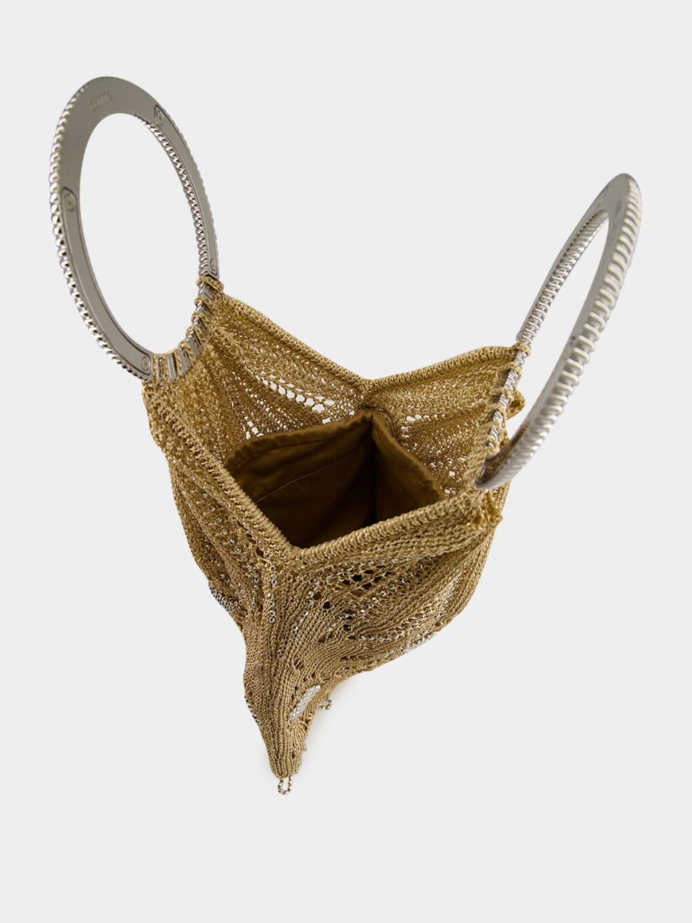 This exquisite handcrafted crochet handbag from Rabanne is a true statement of artisanal luxury. Made from 100% viscose in shimmering light gold metallic thread, it is beautifully adorned with silver beads, creating an intricate and glamorous texture. Featuring sculptural metal ring handles with magnetic closure, the design fuses vintage elegance with contemporary sophistication—perfect for evening occasions or refined summer styling.
