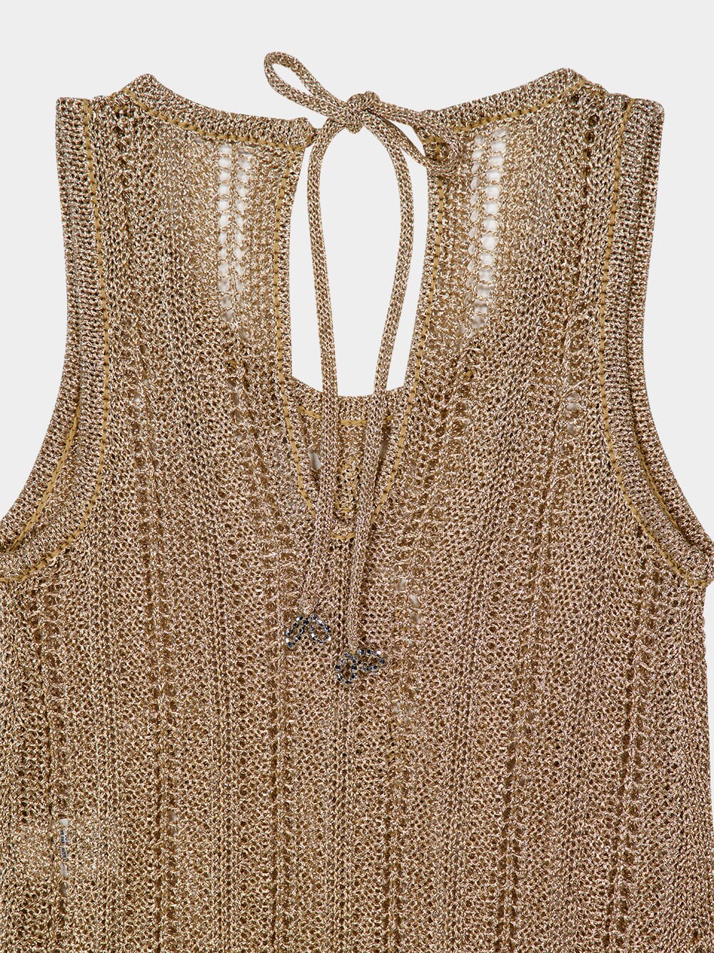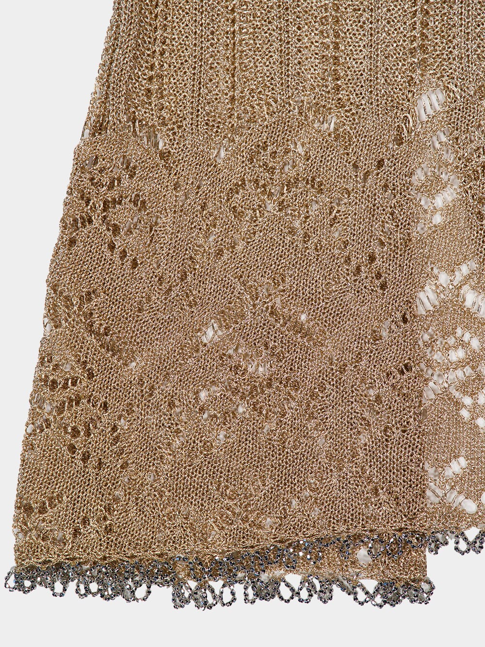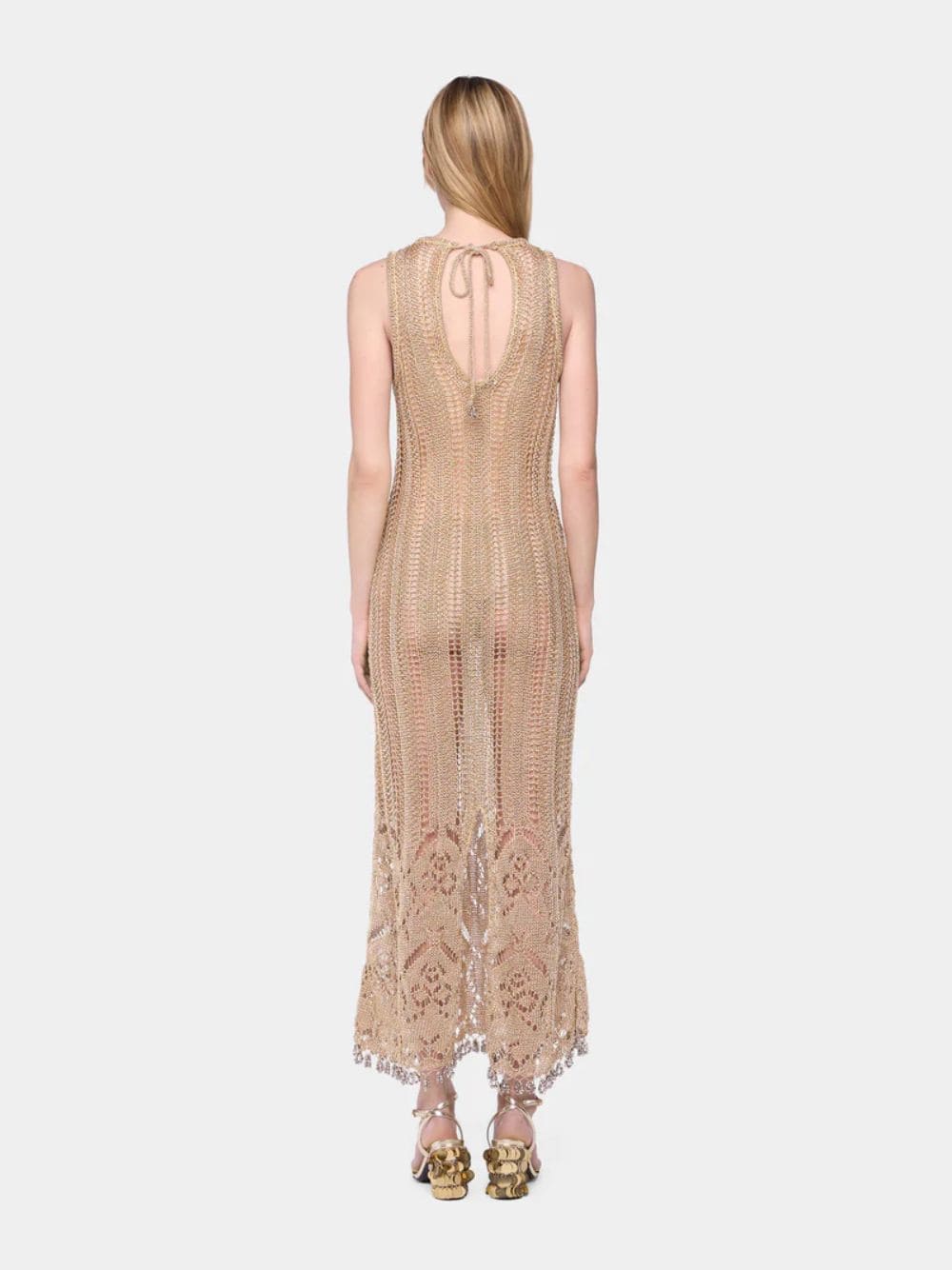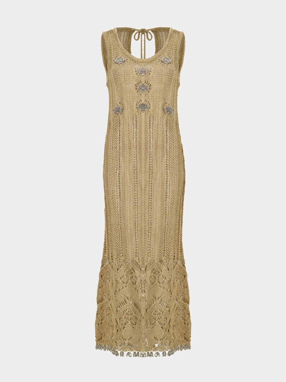 This elegant long dress by Rabanne is crafted in a light gold crochet design, adorned with intricate silver bead embroidery. Featuring a sleeveless silhouette, crew neck, and ankle-length hem, the piece showcases detailed stitching patterns that enhance its artisanal appeal. Made from a refined blend of viscose, paper, and nylon, it drapes gracefully for a glamorous, bohemian-chic statement.