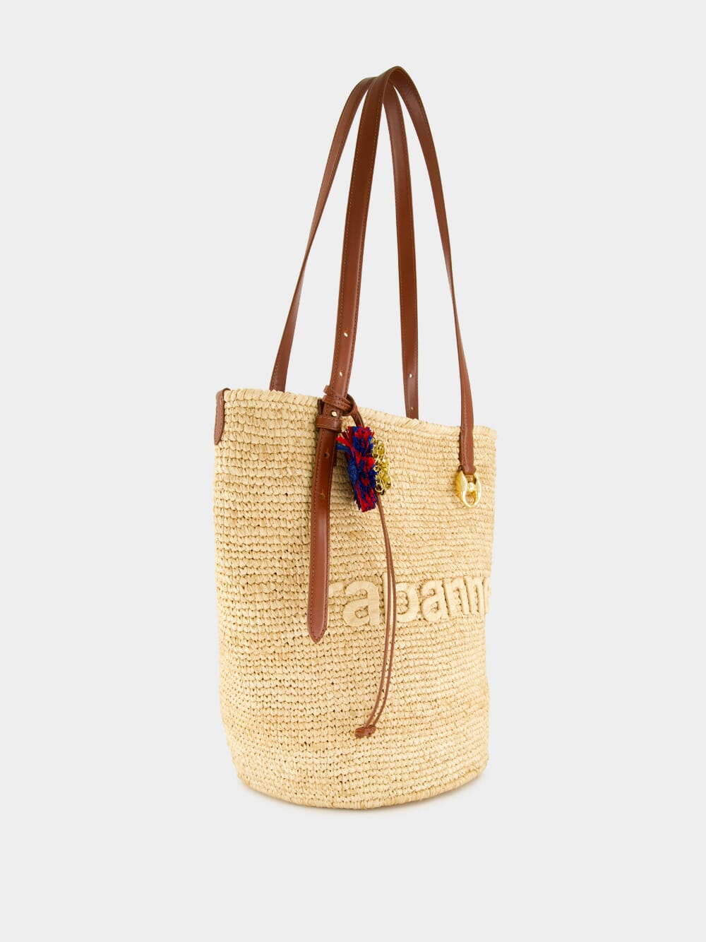 Crafted from natural raffia, this basket-style tote bag by Rabanne is detailed with dual adjustable brown leather handles and adorned with a signature charm featuring 1969 metal discs and colorful braided raffia. A perfect blend of artisanal craftsmanship and iconic design, ideal for elevating summer ensembles with effortless elegance.
