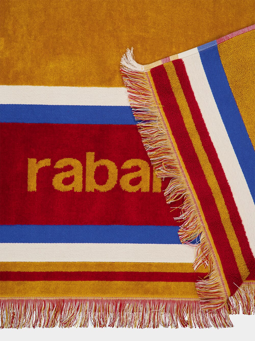 This orange beach towel by Rabanne blends vibrant design with luxurious comfort. Made in Portugal from 100% cotton, it features a colourful striped pattern along the edges and a contrasting embroidered Rabanne logo. Soft and absorbent, it’s perfect for sun-soaked escapes and seaside lounging, adding a bold touch of style to your summer essentials.