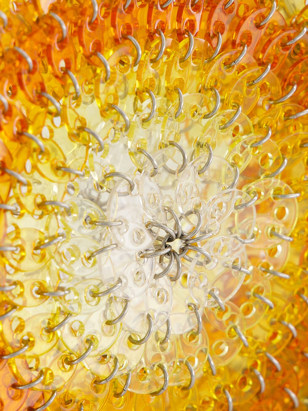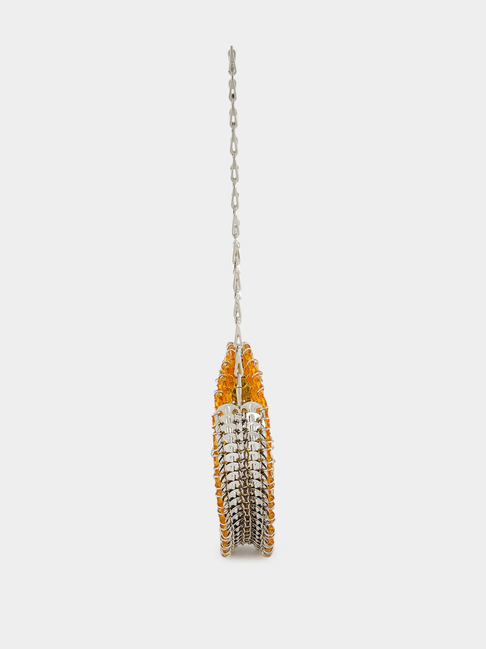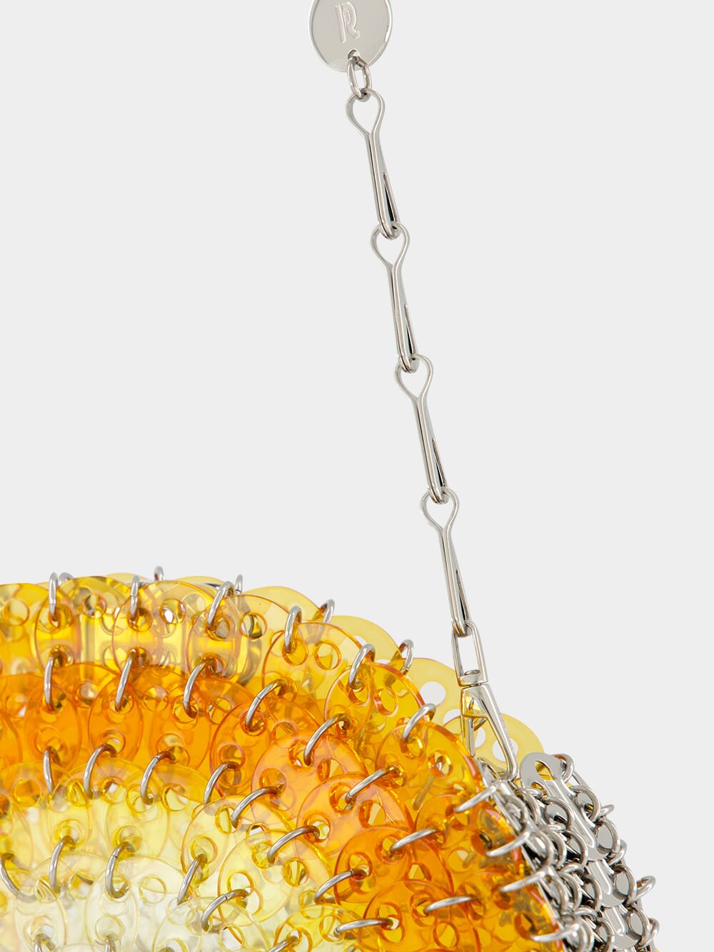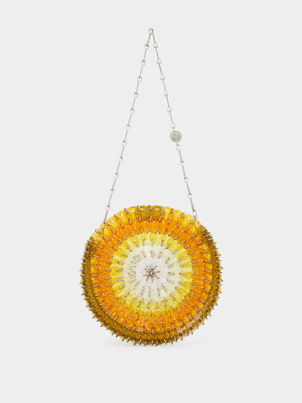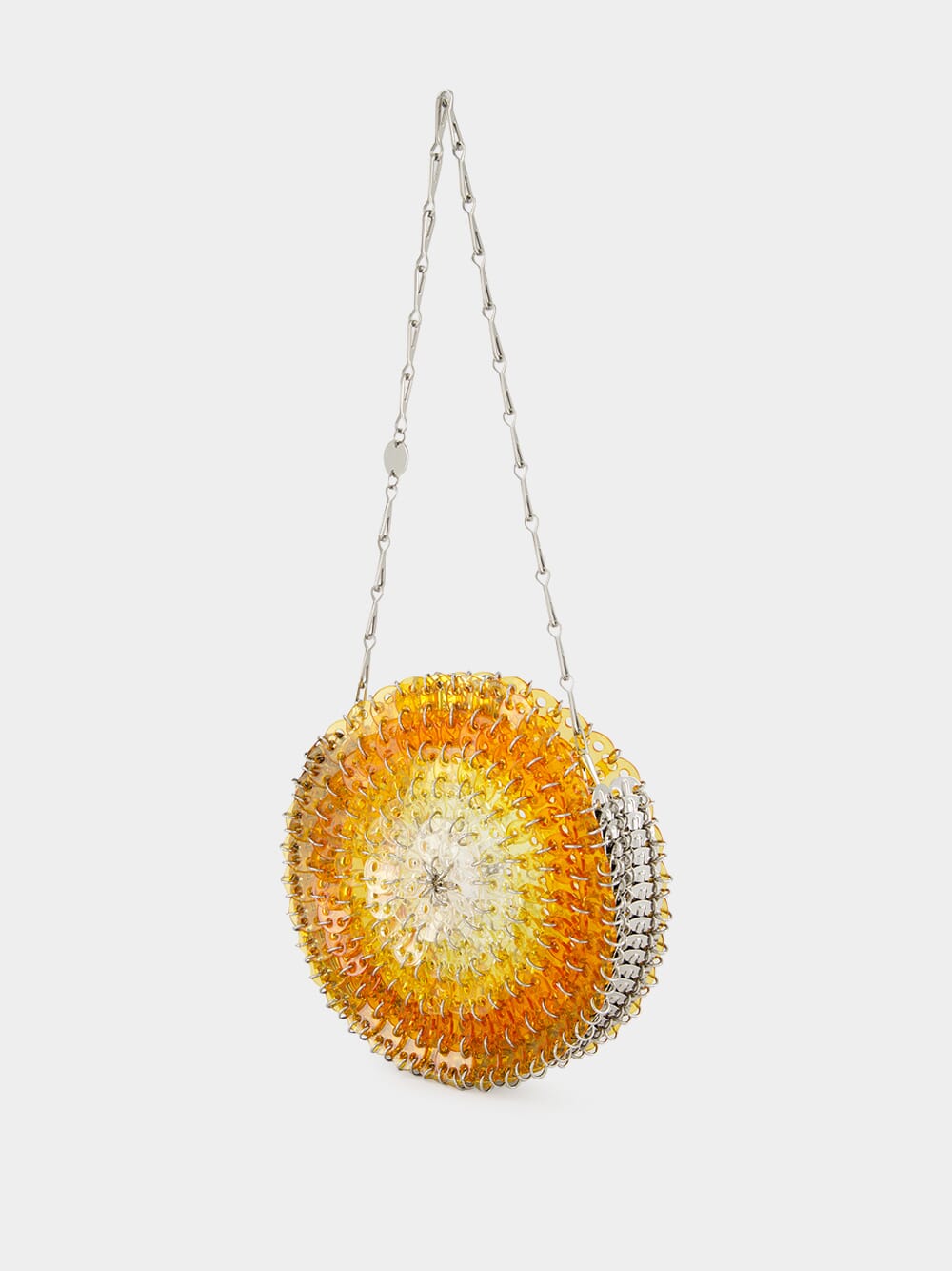 The Round 1969 Resin Disc Bag in Orange Gradient by Rabanne reimagines the brand’s iconic craftsmanship in a sculptural circular silhouette. Hand-assembled from interlinked acetate discs, this radiant piece transitions through warm orange tones in a sun-drenched gradient, bordered by polished silver-tone discs for a bold finish. The structured round shape is suspended from the signature silver double chain strap, offering a striking blend of modern geometry and retro allure. Secured with a discreet magnetic closure engraved with the Rabanne logo, this collectible piece is both a visual statement and a testament to artisanal construction.