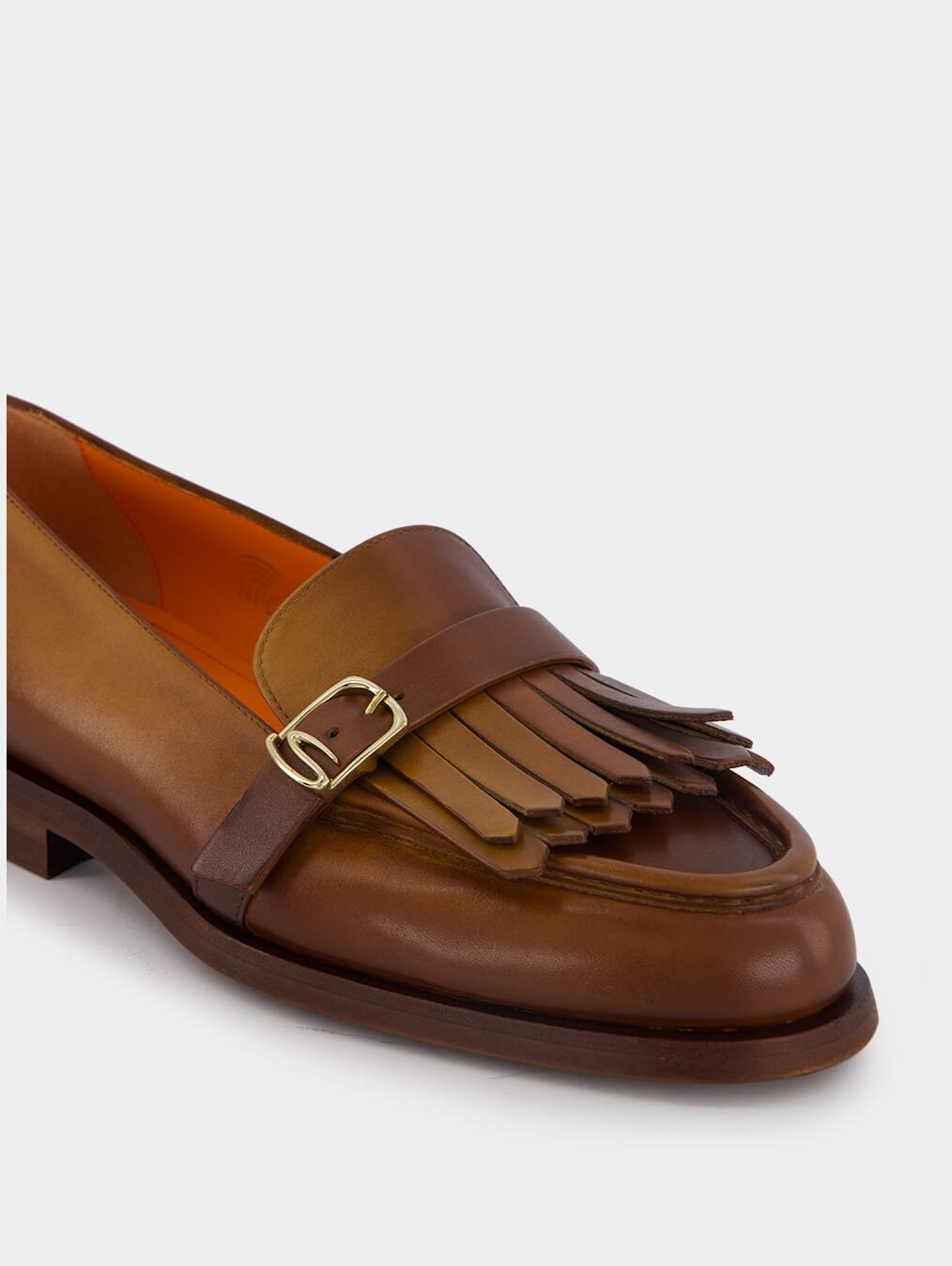 Polished Brown Leather Fringe Loafer, meticulously crafted from hand-polished leather for timeless sophistication. This classic silhouette, featuring a round toe and double fringe detail, exudes unparalleled style. The S-shaped buckle adds a touch of elegance, while the leather lining and sole ensure comfort and durability. Complete with a printed Santoni logo on the insole, these loafers are a blend of fashion and quality that will leave a lasting impression.
