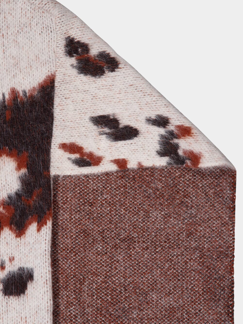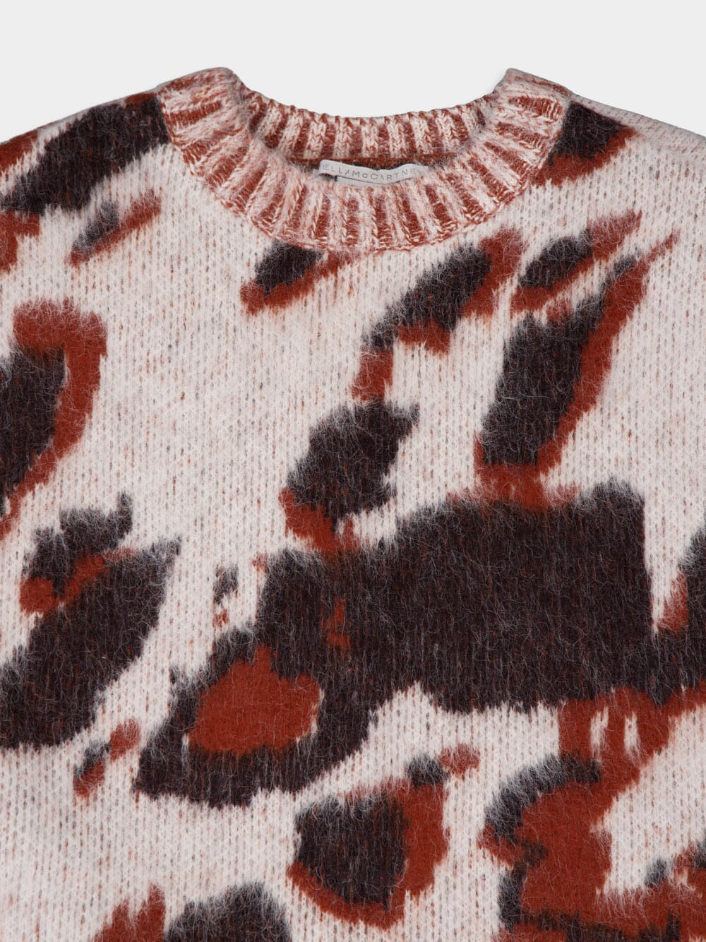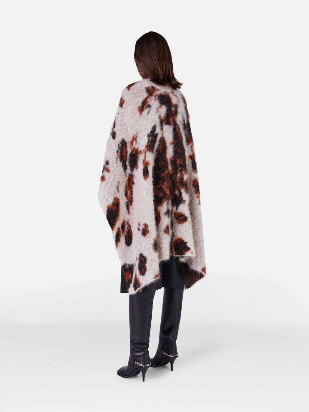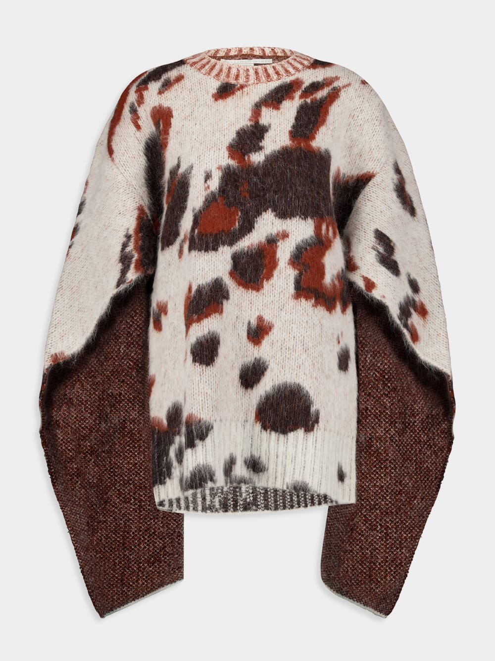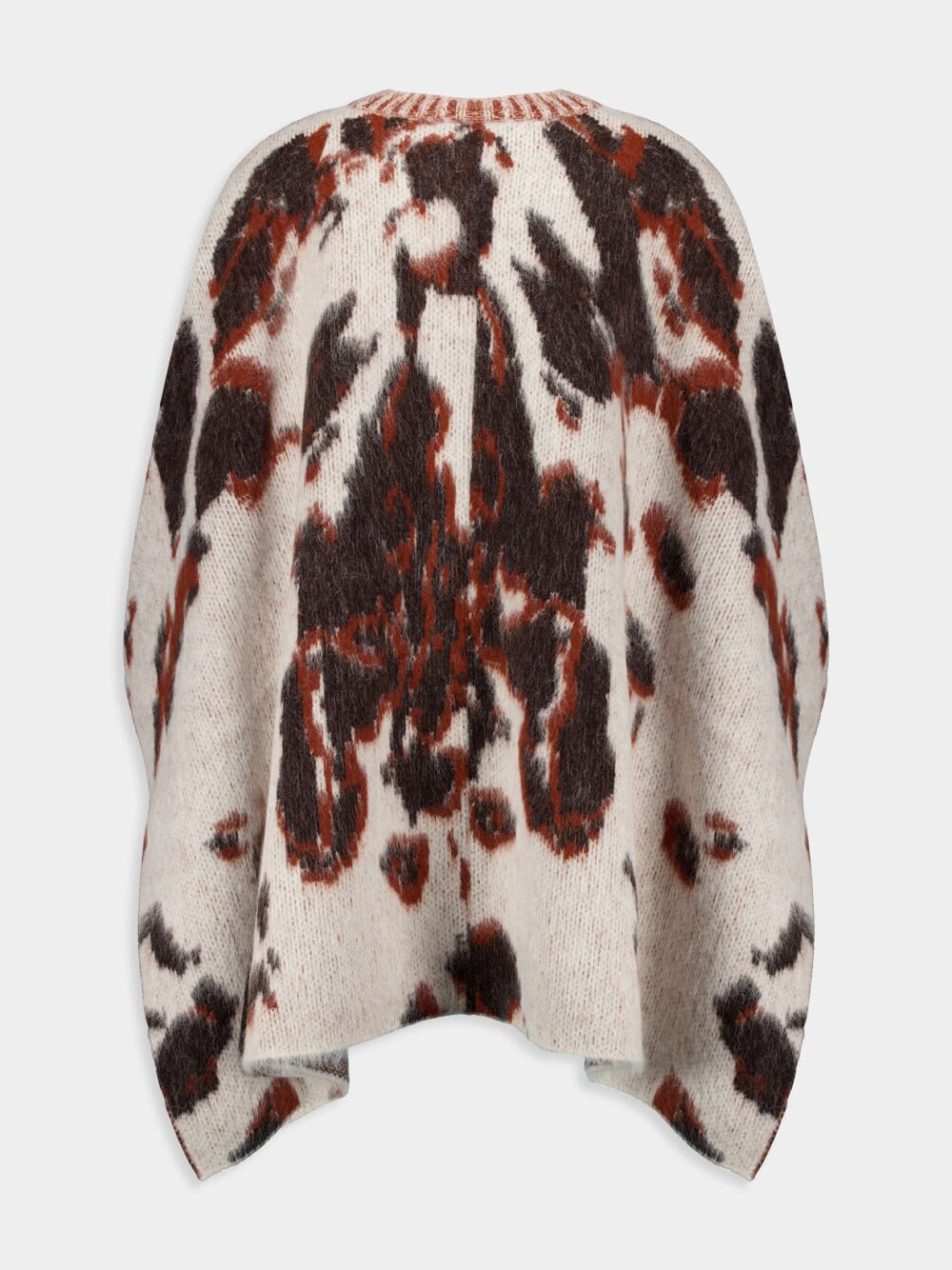 Appaloosa Pony Jacquard Knit Cape Jumper. Crafted from a luxurious alpaca wool-blend, this knitwear boasts a meticulously knitted construction. Its eye-catching patterned jacquard design, combined with a classic crew neck, makes it a versatile choice for any occasion. The long wide sleeves and rear cape insert add a touch of elegance, while ribbed cuffs and hem provide a snug fit.