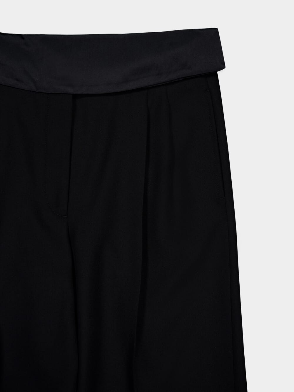 Wide Leg Tuxedo Wool Trousers—a sartorial statement in refined elegance. Crafted from RWS wool tuxedo tailoring fabric, these trousers feature a front pleat leg for a classic touch. The satin tuxedo waistband adds a luxurious contrast, complemented by a zip fly with a hook-and-bar fastening and belt loops for a polished look. With two side slip pockets and one jetted back pocket, these trousers seamlessly blend style and functionality.