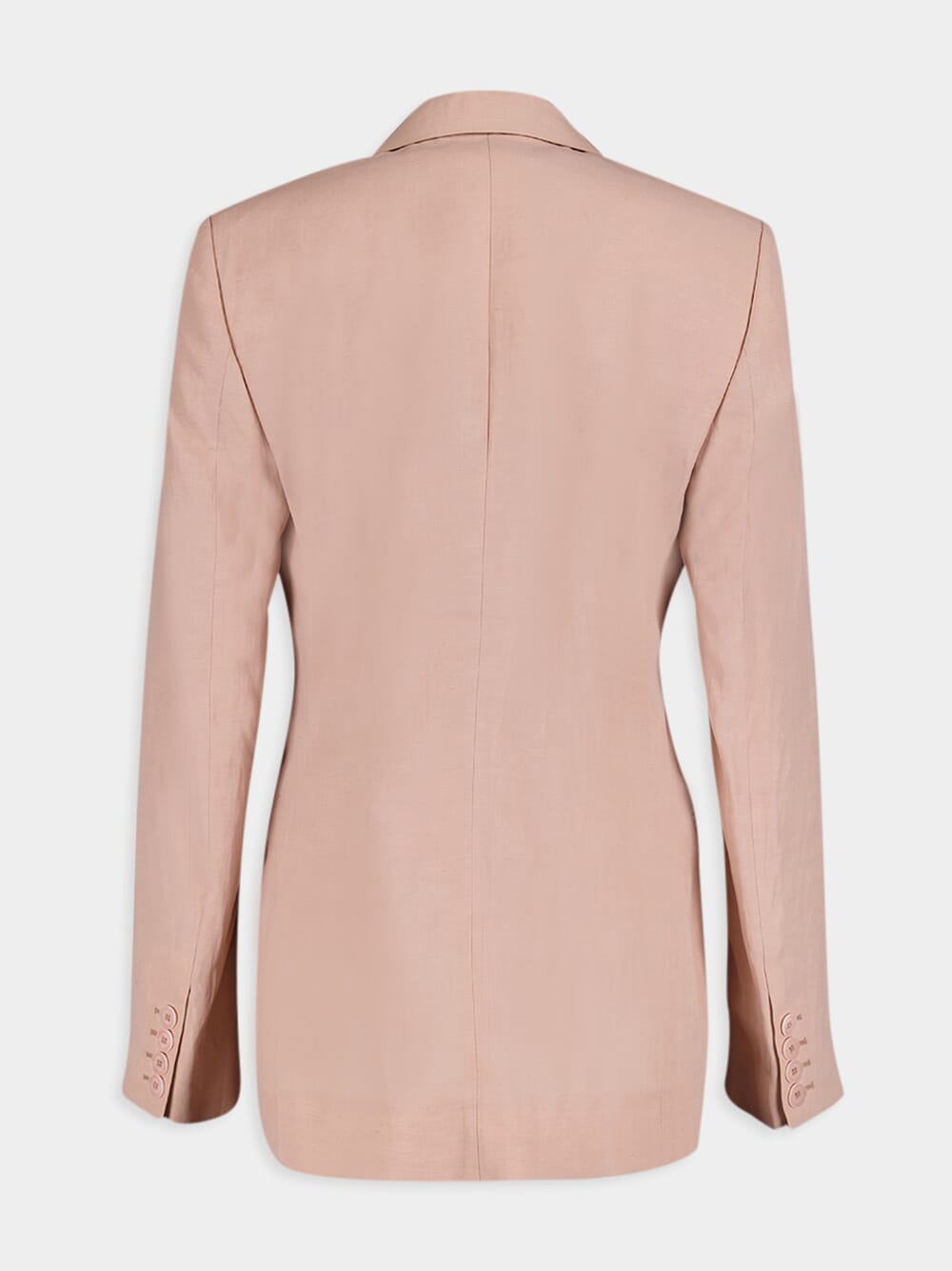 Linen Blend Double-Breasted Blazer, a sustainable masterpiece crafted from a blend of viscose and linen canvas. The wide cut, padded shoulders, and peaked lapels exude a timeless sophistication. The four-button closure and cuffs add a touch of tailored elegance, while three front welt pockets provide both style and functionality.