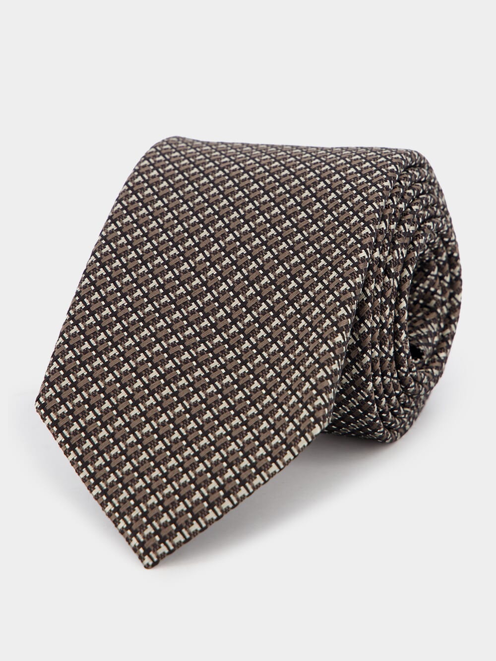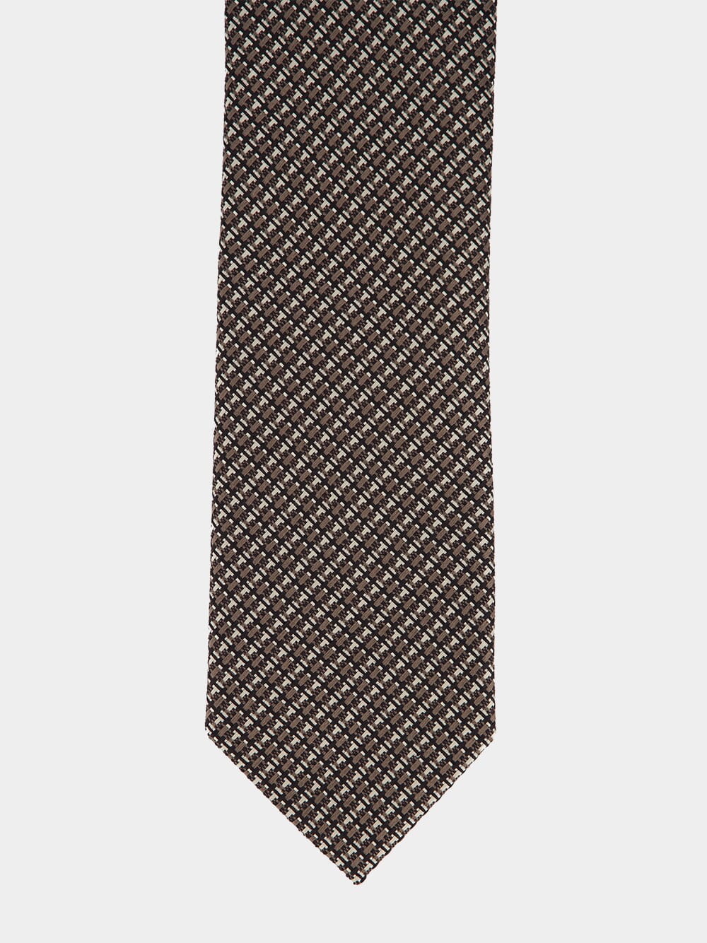 This silk tie, with its refined micro-check pattern, brings a classic yet fresh dimension to business attire. The interplay of brown and beige tones complements a wide range of suit colors, making it a versatile wardrobe staple.