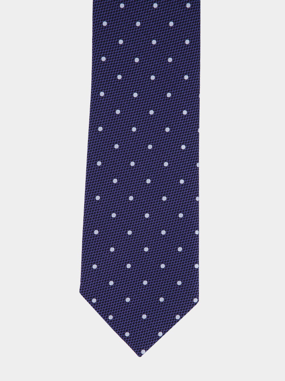 This refined navy tie adorned with crisp white polka dots provides a classic yet spirited look, perfect for the modern professional. The silk weave ensures a smooth finish, making it an impeccable choice for a polished ensemble.