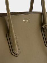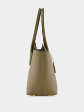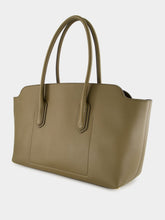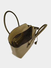 This large shoulder bag in dark olive by Alexander is crafted from luxurious natural grain calfskin leather. Featuring elegant top handles with signature lozenge detail, it includes a detachable charm with padlock, key bell, and matching case. Designed for versatile carry by hand, elbow or shoulder, it offers a spacious main compartment, interior zip and open pockets, and suede leather lining. Finished with bottom studs and a secure zipped closure.
