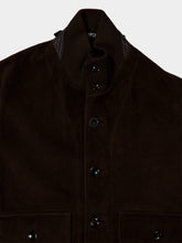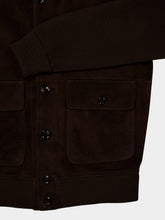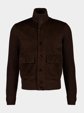 This deep brown jacket by Tom Ford merges refined tailoring with luxurious texture. Crafted from supple lamb suede, it features contrasting ribbed merino wool sleeves, a cotton lining for breathable comfort, and horn buttons that add artisanal depth. A modern interpretation of classic outerwear with rich tactile detail.