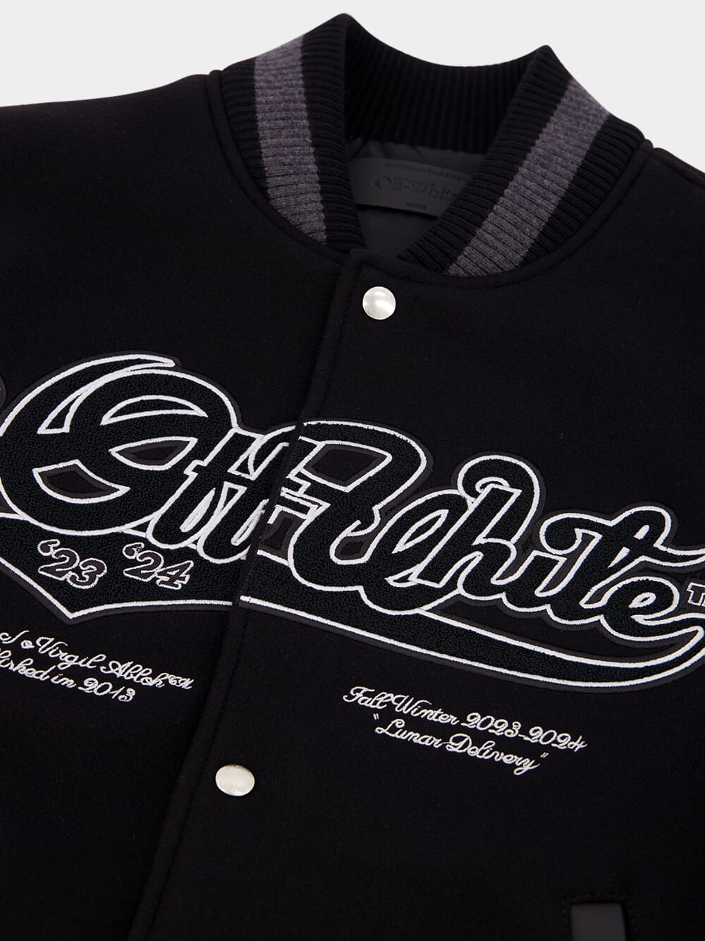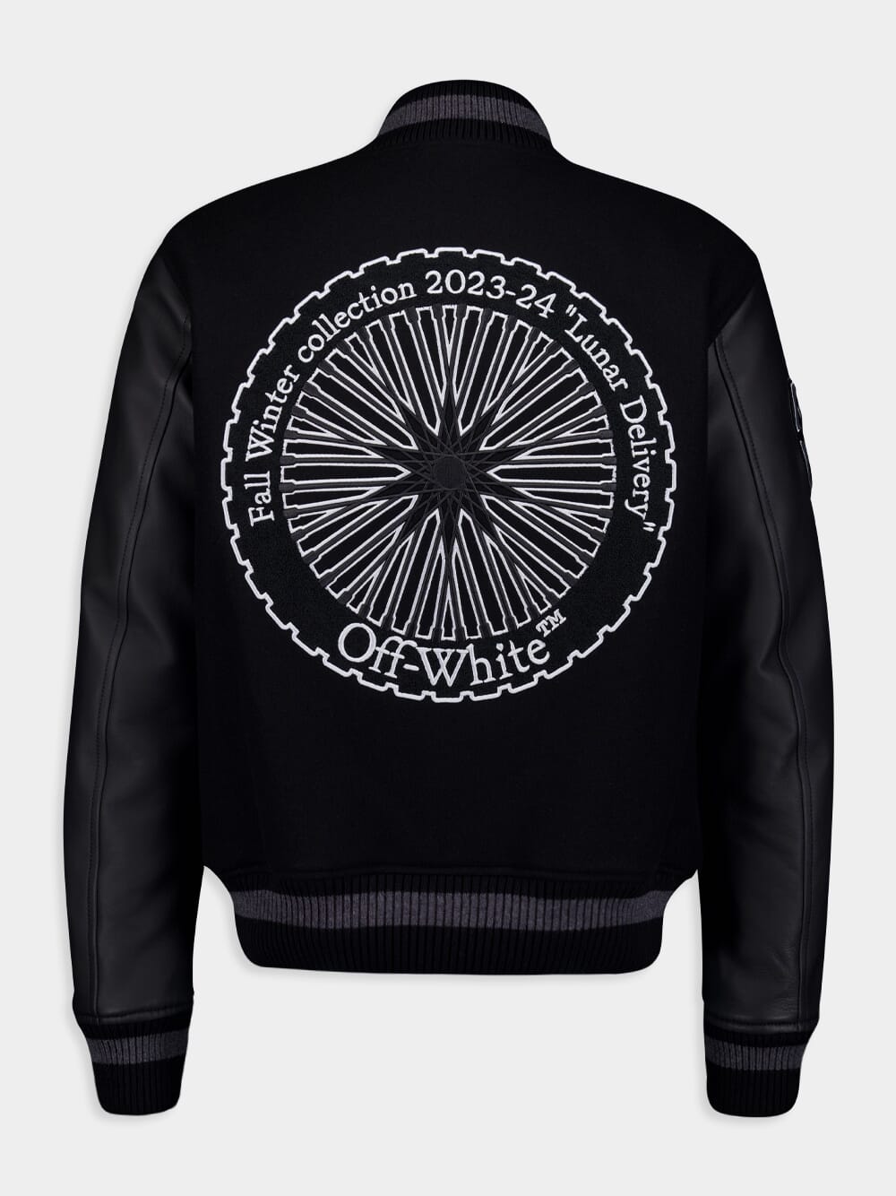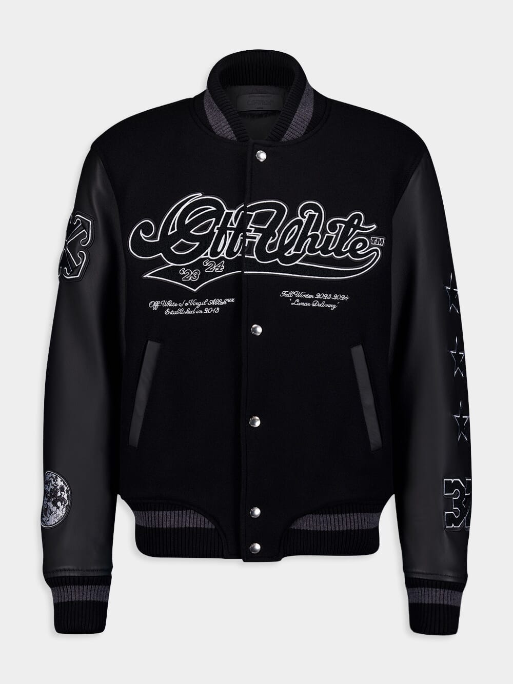 Tyre Moon Appliquéd Varsity Jacket, a perfect blend of style and comfort. Crafted with supple leather sleeves and a substantial wool-blend, this jacket boasts striking appliquéd patches, including a moon, seasonal logo, and arrow emblem.