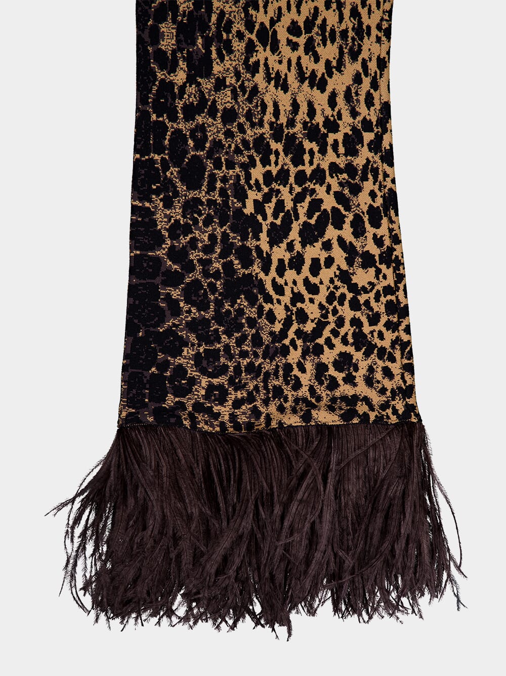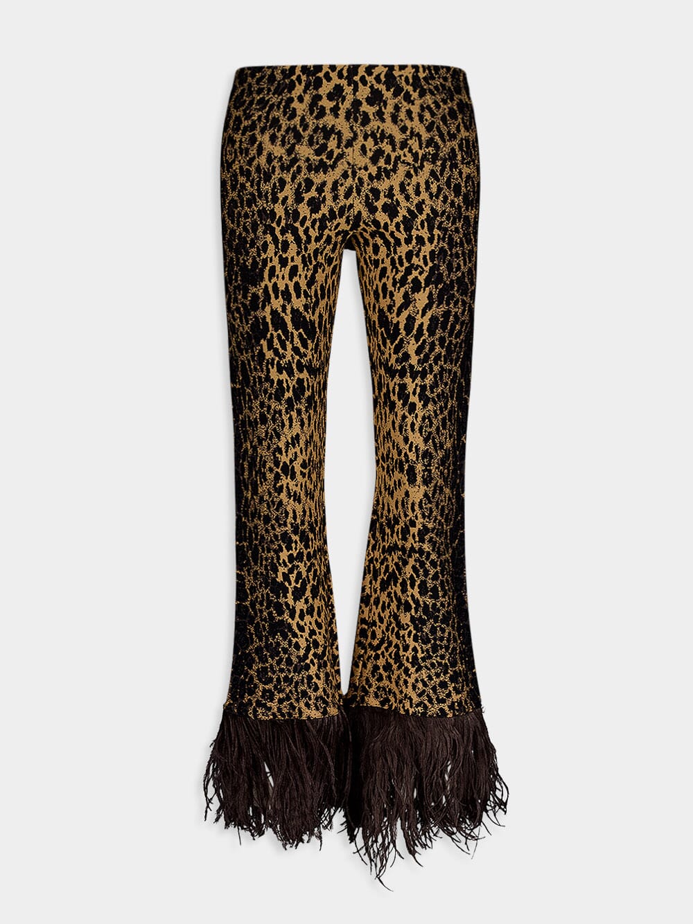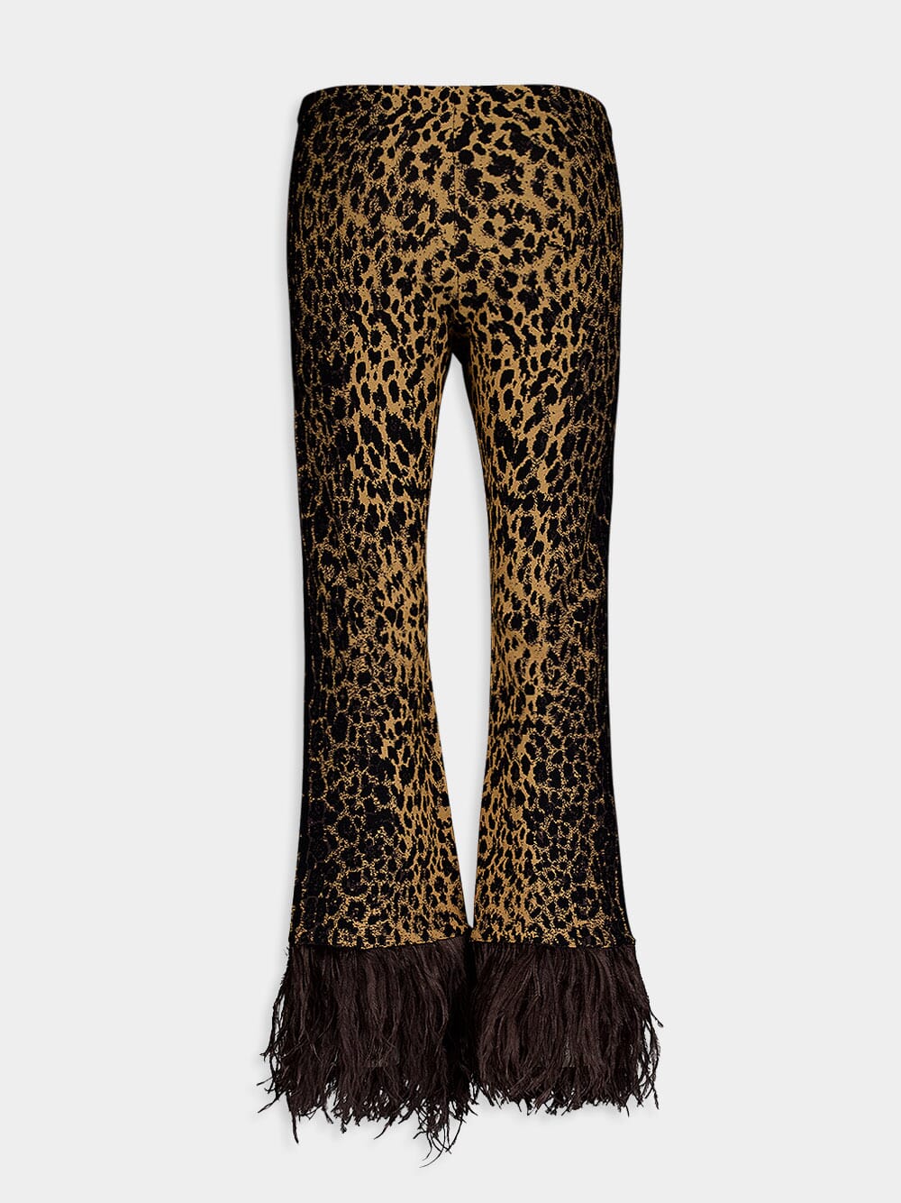 Make a bold statement with these leopard print flare trousers, adorned with a playful feather hem. The eye-catching pattern and flared silhouette are perfect for fashion-forward individuals who want to add a wild touch to their wardrobe.