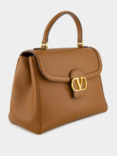The Valentino Garavani 9to5 large handbag is an emblem of refined structure and everyday sophistication. Crafted in rich tobacco brown calfskin, it features a sleek top handle and adjustable shoulder strap for versatile wear. The flap closure is adorned with the iconic gold VLogo hardware, enhancing its timeless charm. Spacious and impeccably constructed, this is a statement piece for the modern woman.